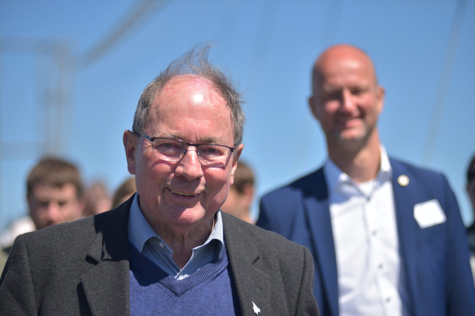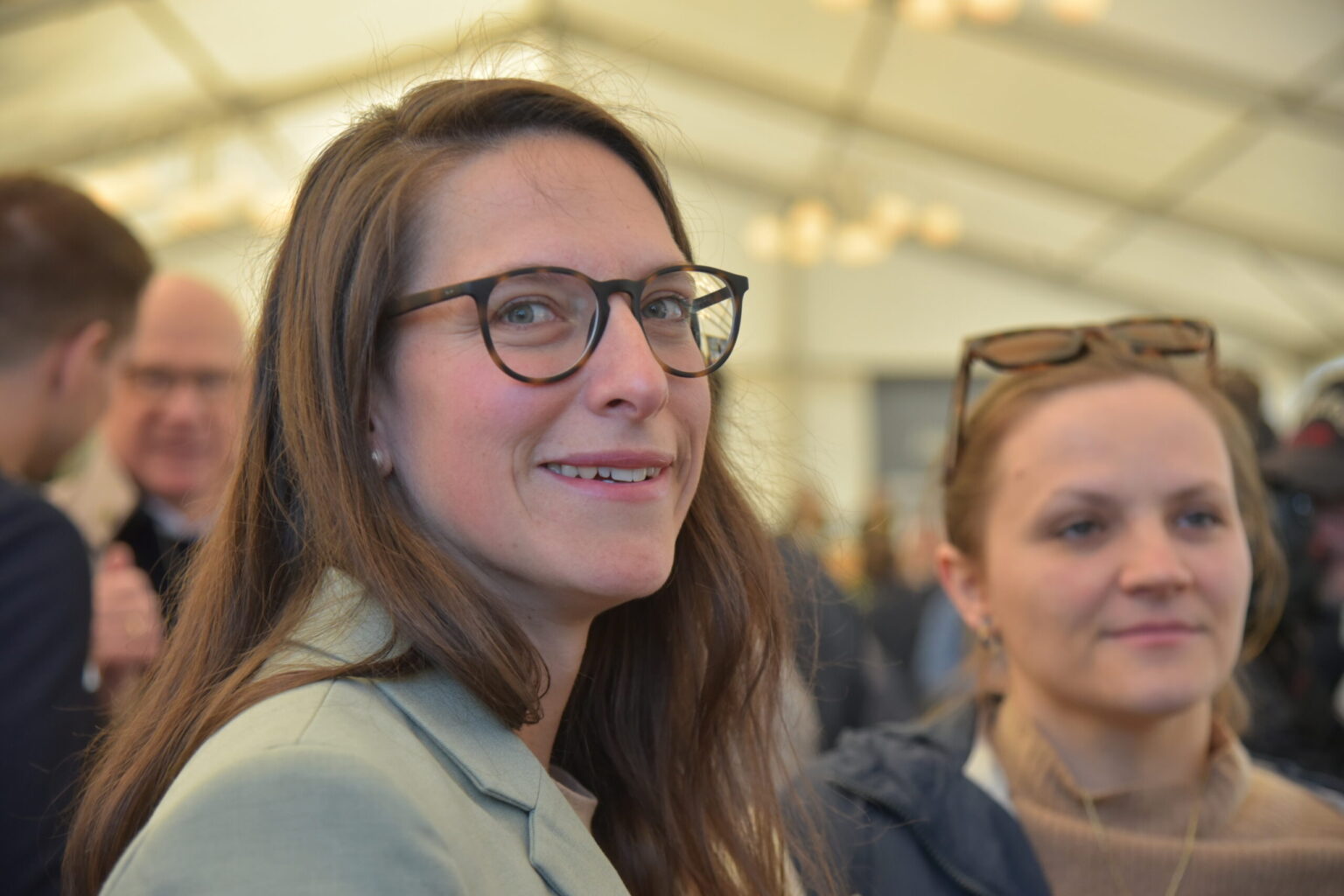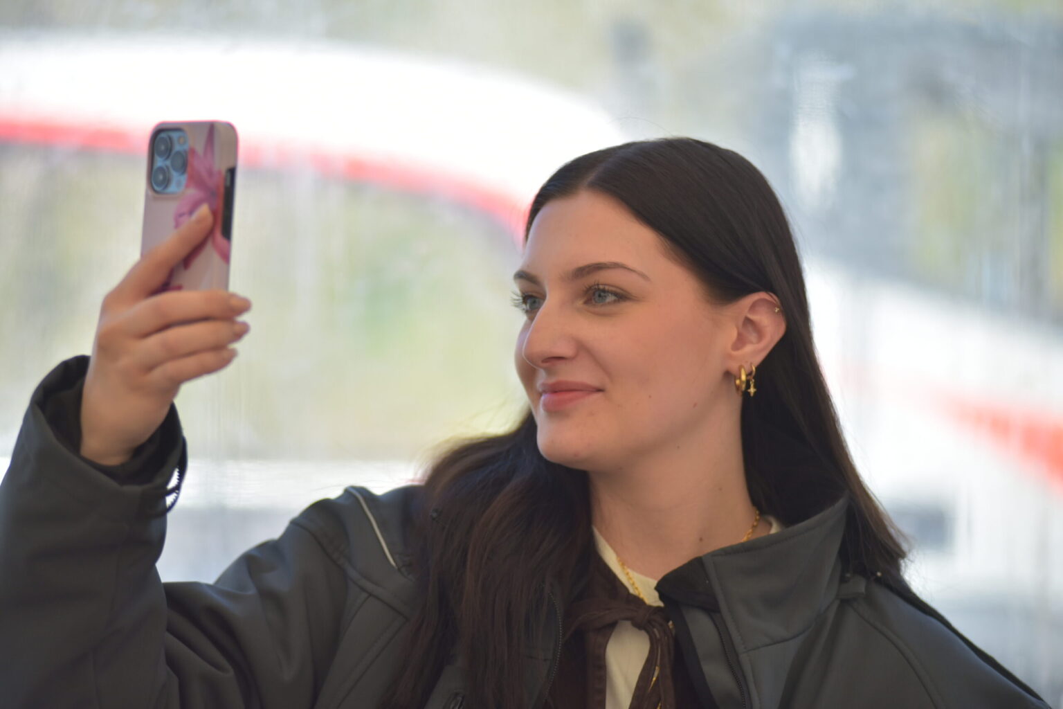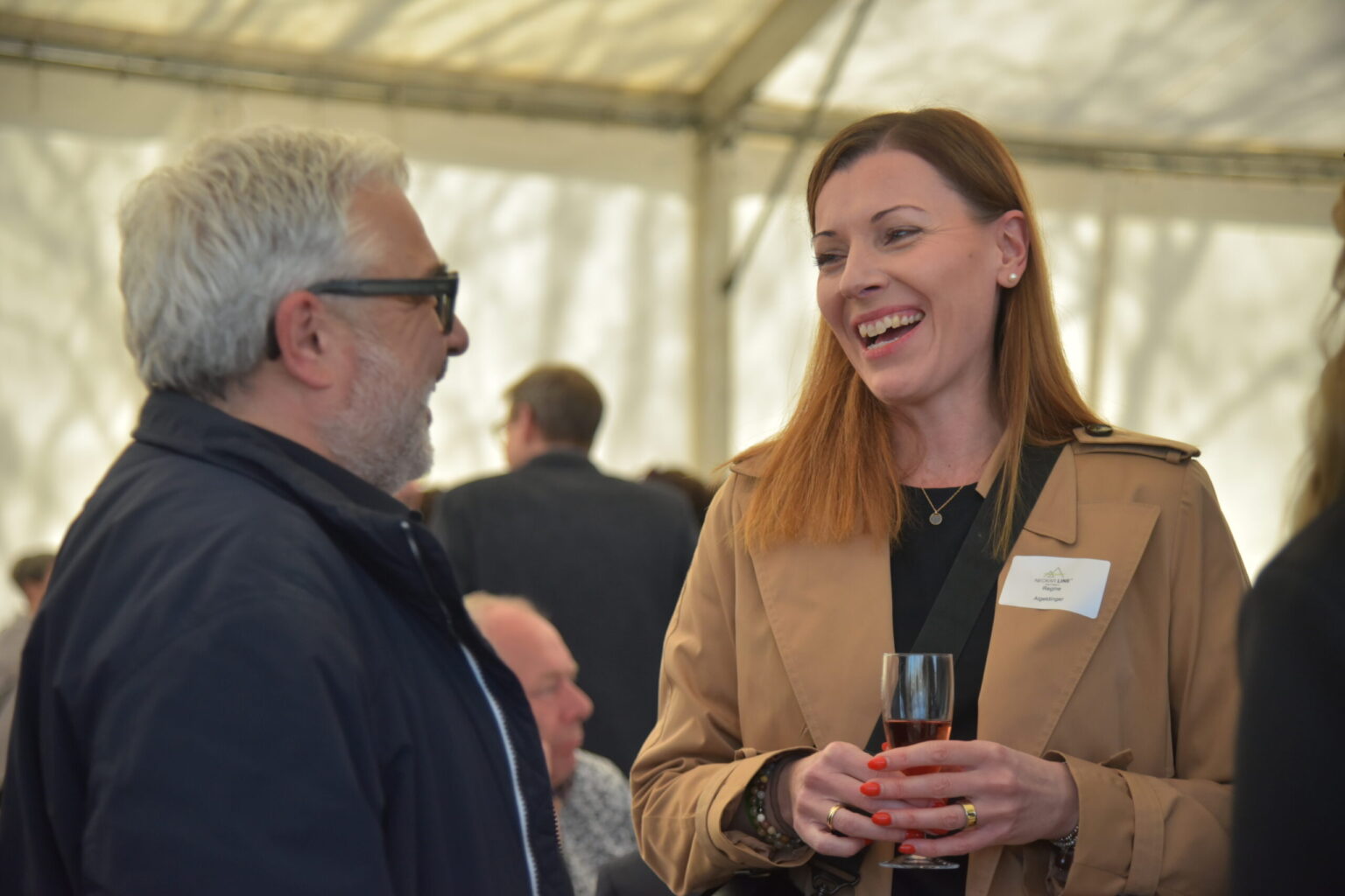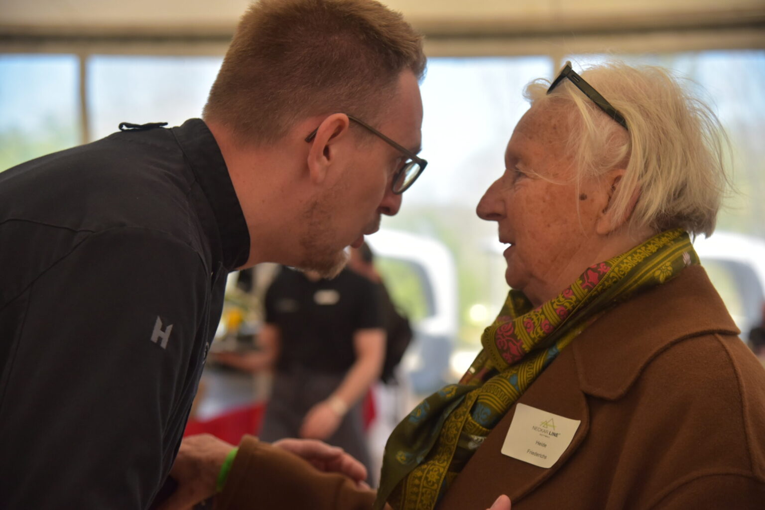 Noch bevor die neue Fußgänger-Hängebrücke Neckarline für die Öffentlichkeit zugänglich ist, wurde sie am Donnerstag, 23. April 2026, im Rahmen einer internen Eröffnungsveranstaltung erstmals offiziell in Betrieb genommen. Rund 300 geladene Gäste aus Politik, Wirtschaft und der Region kamen dazu am Vormittag auf dem Berner Feld zusammen. Sie schwankten anschließend fast allesamt über die neue Brücke auf die Innenstadt zu.