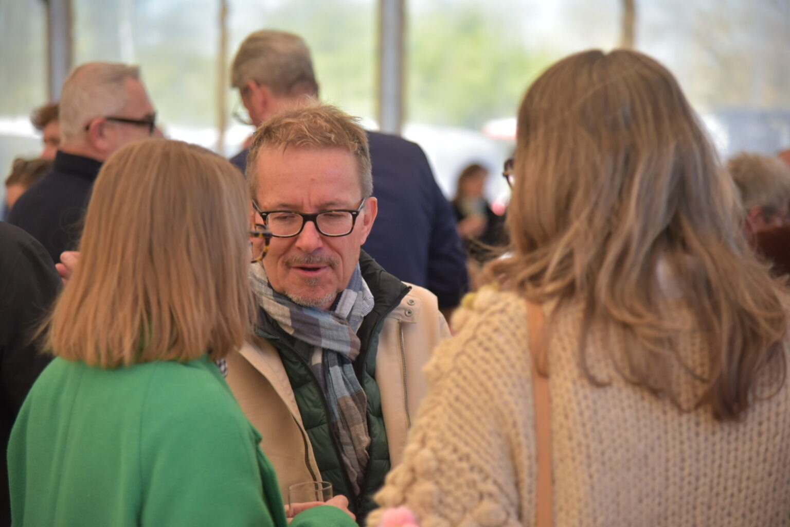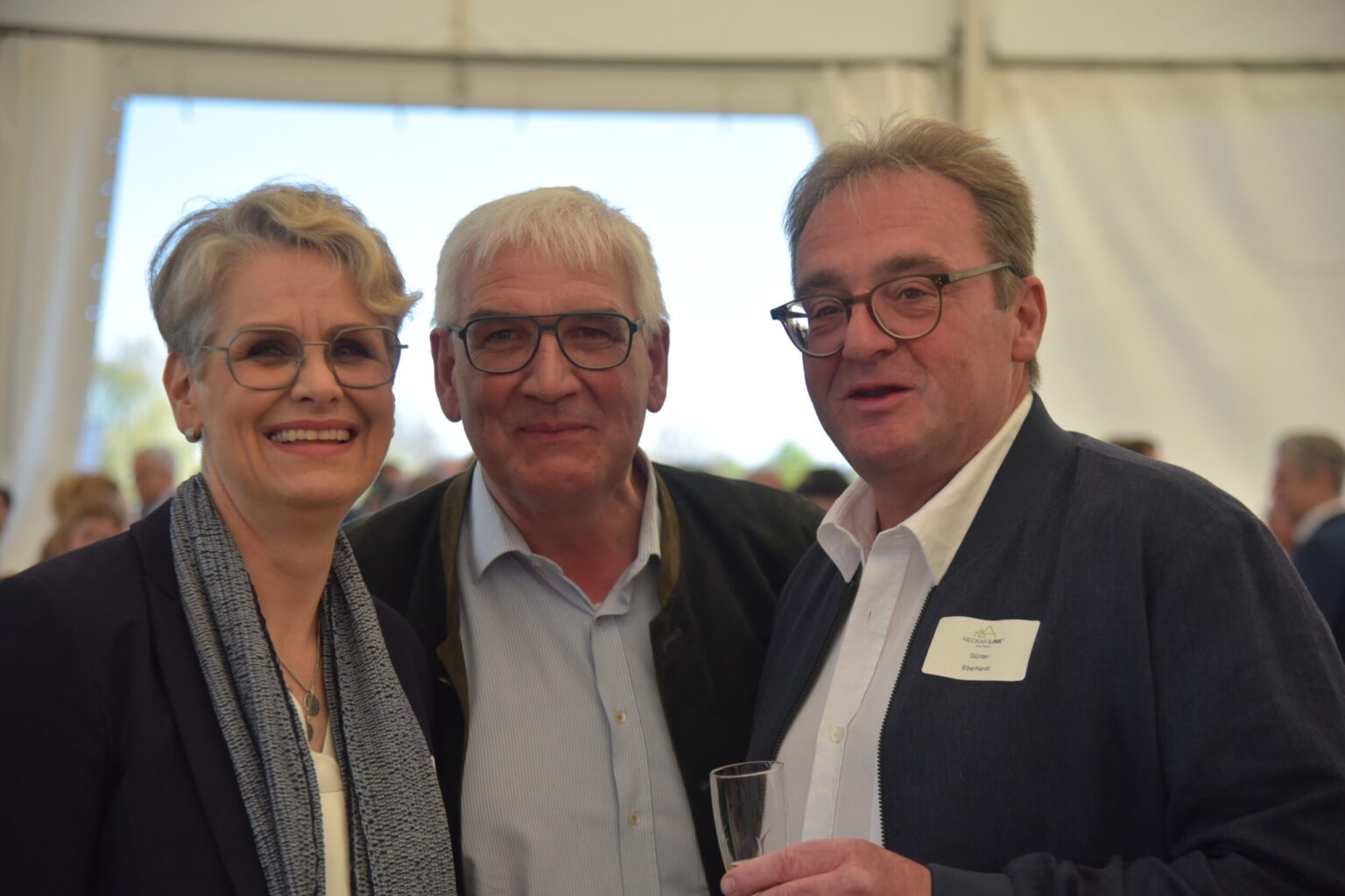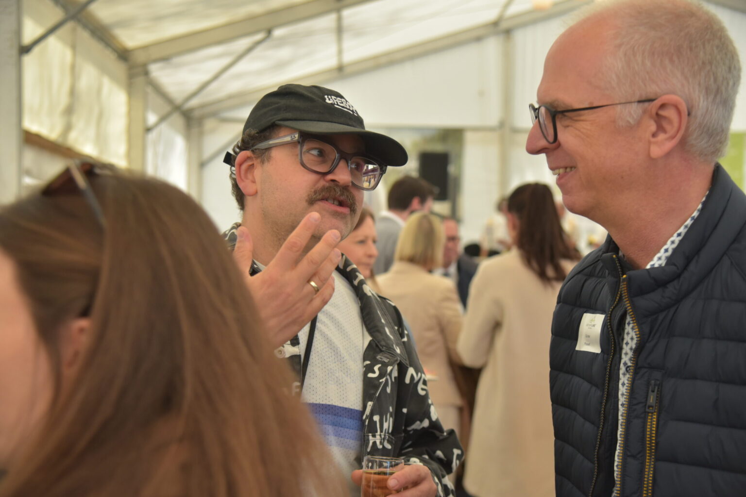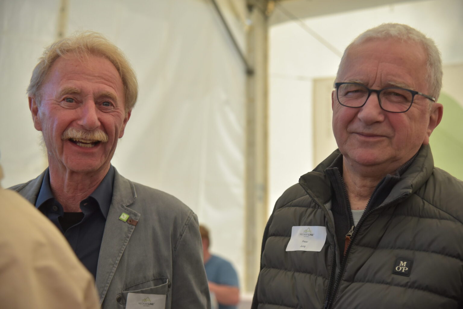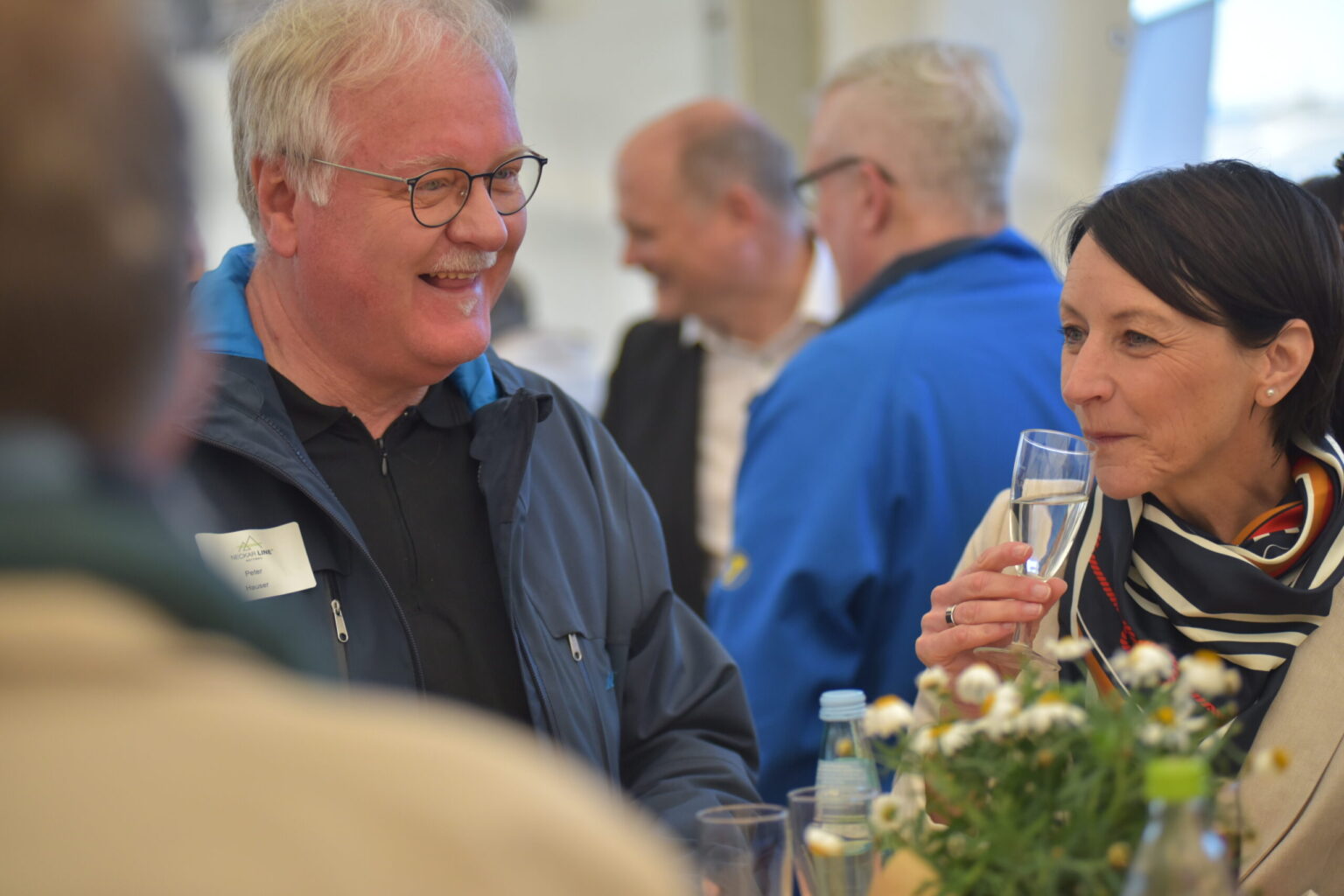 Noch bevor die neue Fußgänger-Hängebrücke Neckarline für die Öffentlichkeit zugänglich ist, wurde sie am Donnerstag, 23. April 2026, im Rahmen einer internen Eröffnungsveranstaltung erstmals offiziell in Betrieb genommen. Rund 300 geladene Gäste aus Politik, Wirtschaft und der Region kamen dazu am Vormittag auf dem Berner Feld zusammen. Sie schwankten anschließend fast allesamt über die neue Brücke auf die Innenstadt zu.