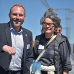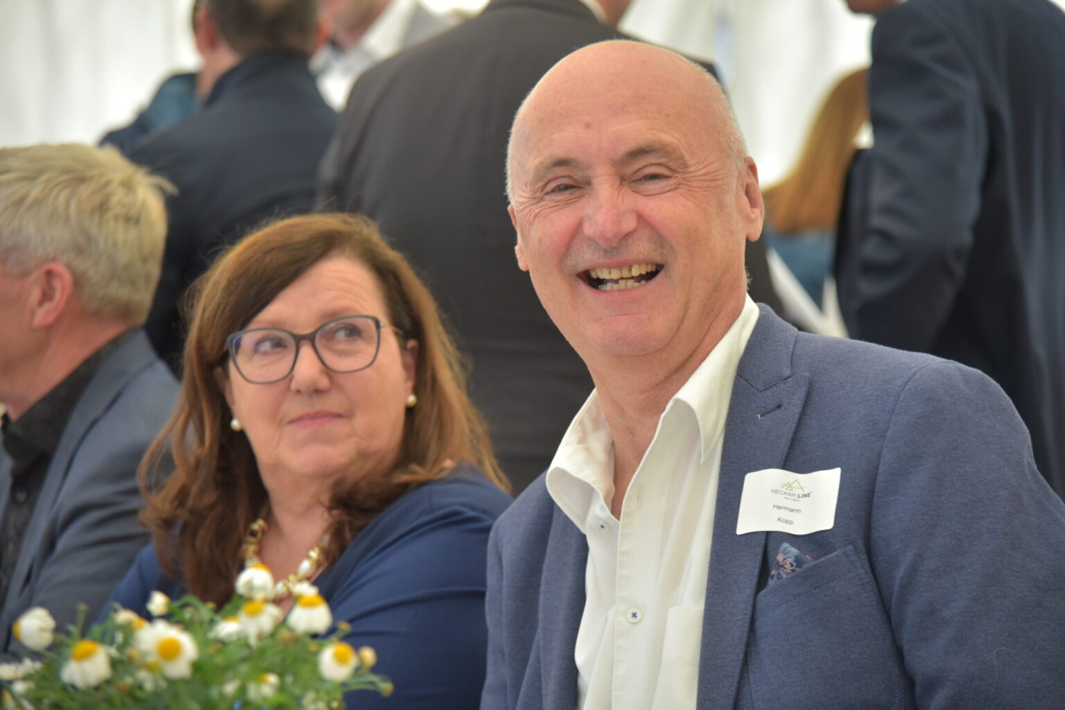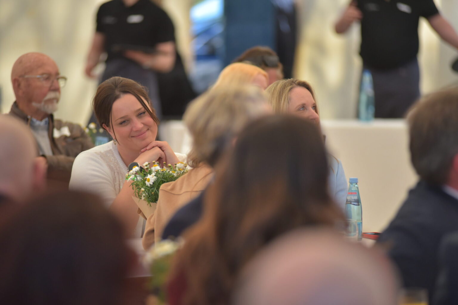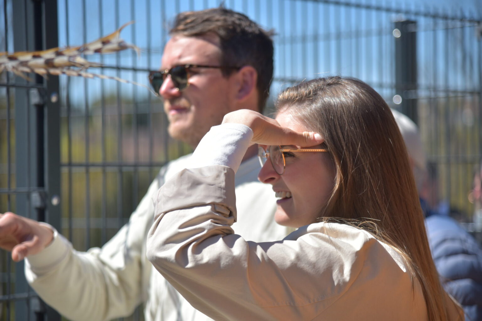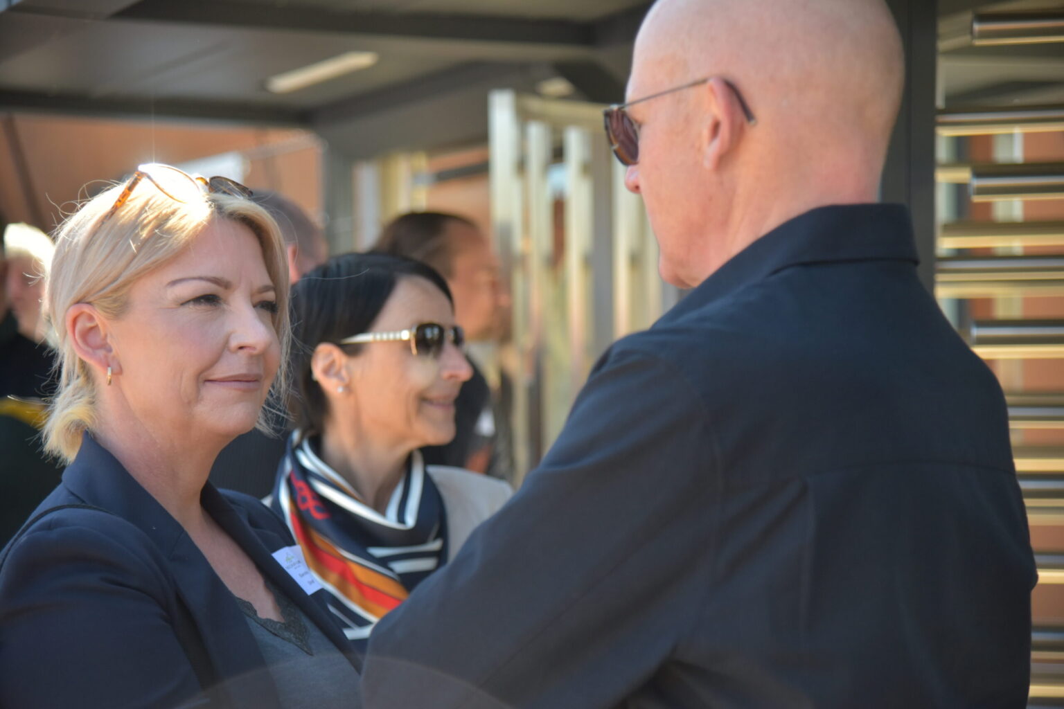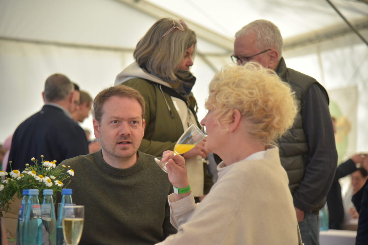 Noch bevor die neue Fußgänger-Hängebrücke Neckarline für die Öffentlichkeit zugänglich ist, wurde sie am Donnerstag, 23. April 2026, im Rahmen einer internen Eröffnungsveranstaltung erstmals offiziell in Betrieb genommen. Rund 300 geladene Gäste aus Politik, Wirtschaft und der Region kamen dazu am Vormittag auf dem Berner Feld zusammen. Sie schwankten anschließend fast allesamt über die neue Brücke auf die Innenstadt zu.