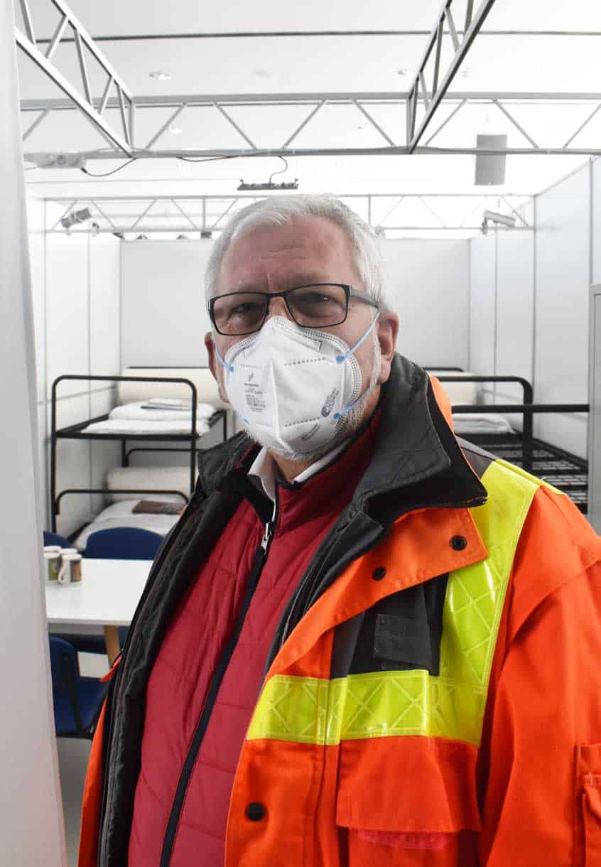 Dessen Kreisbereitschaftsleiter Michael Häring bot dem Landkreis an, mit Verpflegung auszuhelfen, wenn mal Geflüchtete zu ungewöhnlichen Zeiten im Kreis ankommen sollten. Er lobte die Zusammenarbeit mit den anderen Beteiligten als „phänomenal gut“. Bereits vor zwei Jahren sei der damals brandneue Saal für den Notfall der beginnenden Coronapandemie hergerichtet worden, erinnerte er. Benötigt wurde der Saal dann, zur Freude aller, aber nicht. Schon zuvor, beginnend 1989 mit Flüchtlingen aus der untergehenden DDR, hatte die daneben liegende Kreissporthalle als Notlager dienen müssen, wie auch 2015.