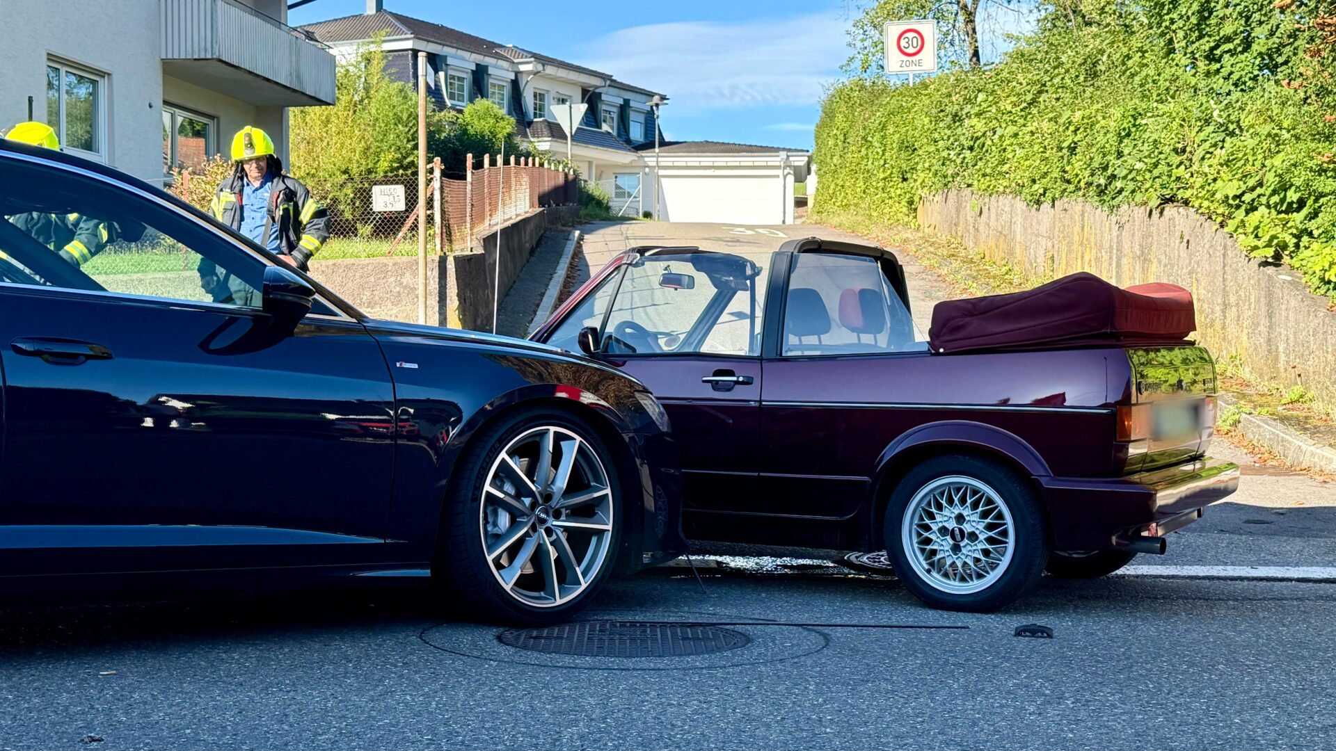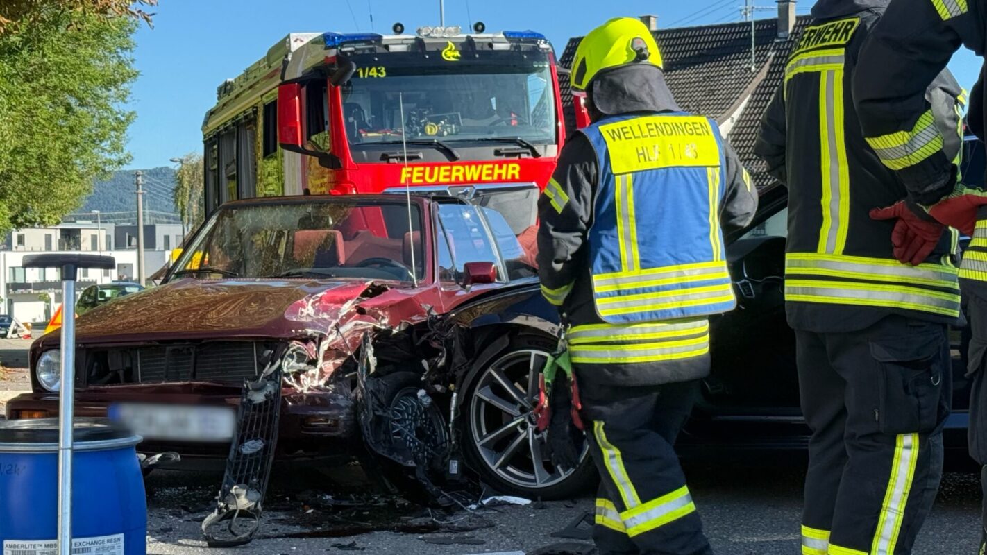 Denn: Gut zehn Minuten, nachdem dieser Artikel online gegangen ist, wird die Feuerwehr Wellendingen an diesem Sonntag zum dritten Mal alarmiert: Verkehrsunfall in der Ortsdurchfahrt. Offenbar beim Linksabbiegen ist eine Audi-Limousine frontal mit einem entgegenkommenden Golf Cabrio, einem Oldtimer, zusammengeprallt. Glücklicherweise wurde niemand ernstlich verletzt. Dennoch war das DRK zum einen mit örtlichen ehrenamtlichen Kräften, zum anderen mit einem Rettungswagen vor Ort, um die Unfallbeteiligten zu untersuchen. Aufgabe der Feuerwehr war es, die Einsatzstelle zu sperren, auslaufende Betriebsstoffe an den beiden am Unfall beteiligten Wagen zu sichern, schließlich auch die Unfallstelle zu räumen. Die Einsatzleitung hatte, wie schon bei dem unnötigen Ölmalheur am Mittag, der Wellendinger Kommandant Daniel Bettinger.