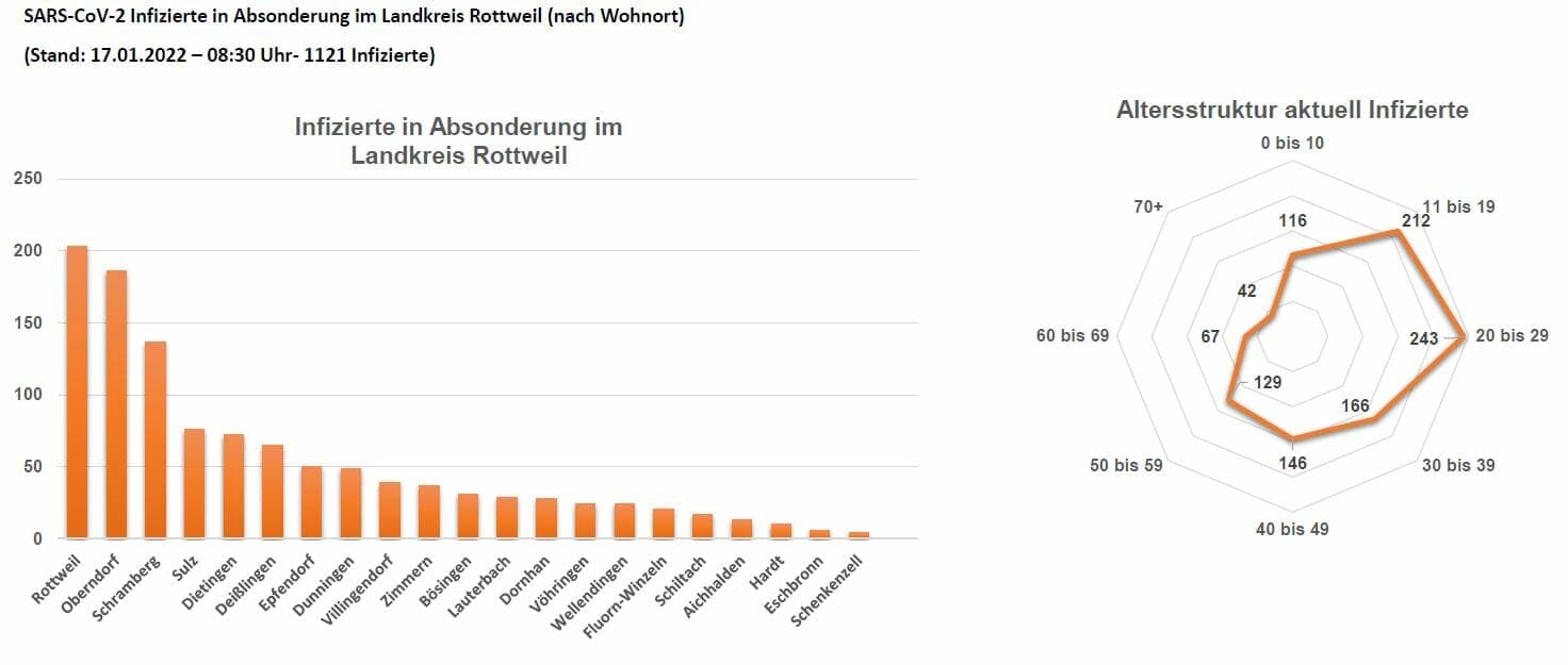 In den beiden Krankenhäusern in Oberndorf und Rottweil seien die Belegungszahlen zurückgegangen und wieder mehr Betten frei. Auf den Intensivstationen lägen in Oberndorf vier Patienten mit Covid 19, davon einer beatmet. In Rottweil sei kein Intensivbett frei, vier seien mit Covid-Patienten belegt.