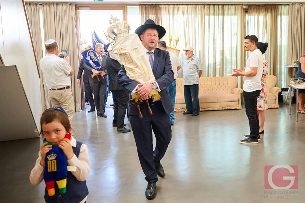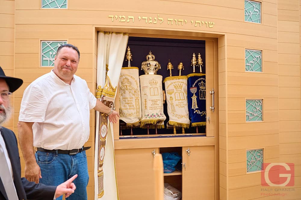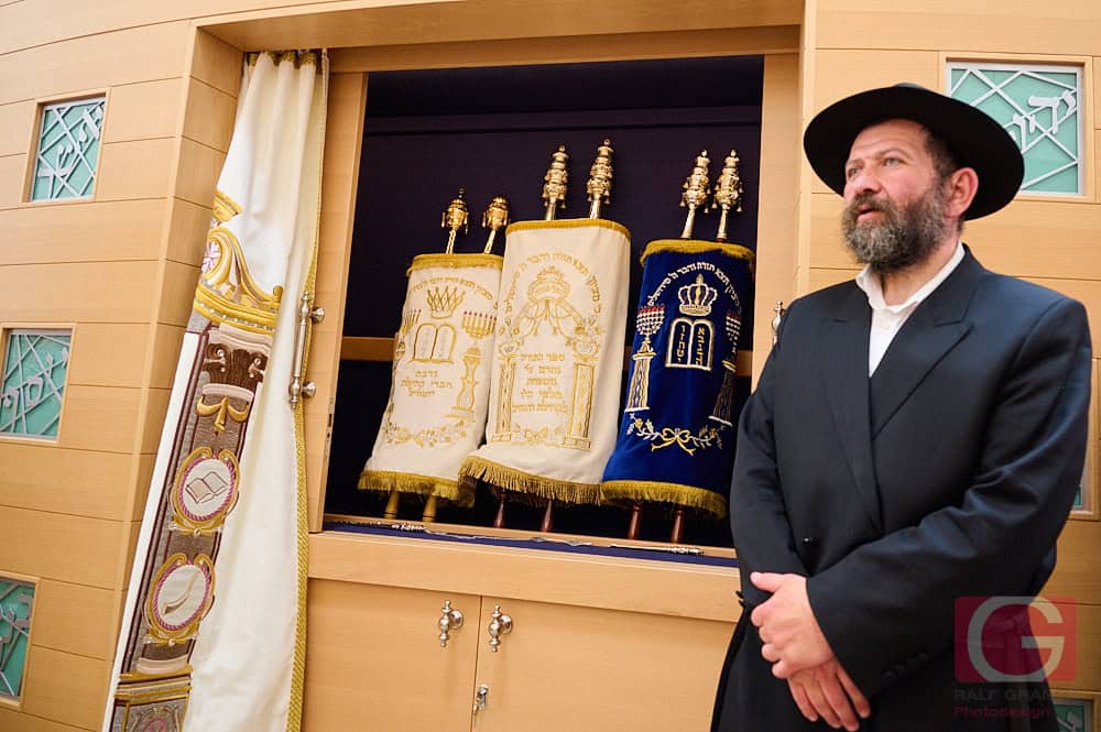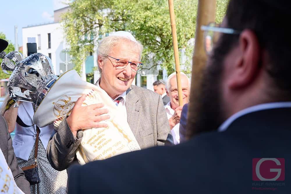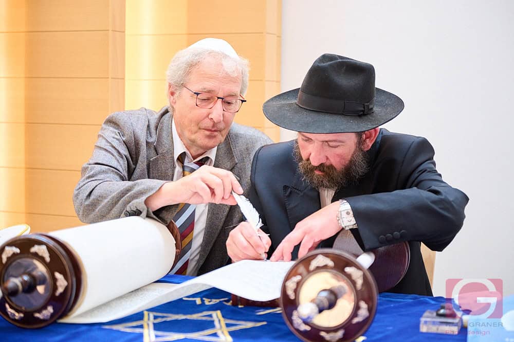 Schließlich wurde die so vollendete Rottweiler Tora in den für sie vorgesehenen Schrank eingebracht. Laut Landesrabbiner Moshe Flomenmann die erste Einweihung einer Torarolle – „der Bedienungsanleitung für unser Leben“ – seit der Coronapandemie. Alle, die auch nur einen Buchstaben zu dieser Torarolle beigetragen haben, gelten damit als deren (Mit-)Besitzer. Wobei dieser Beitrag darin besteht, die Feder an ihrer Spitze sanft zu halten, während der Kalligraph den Buchstaben schreibt.