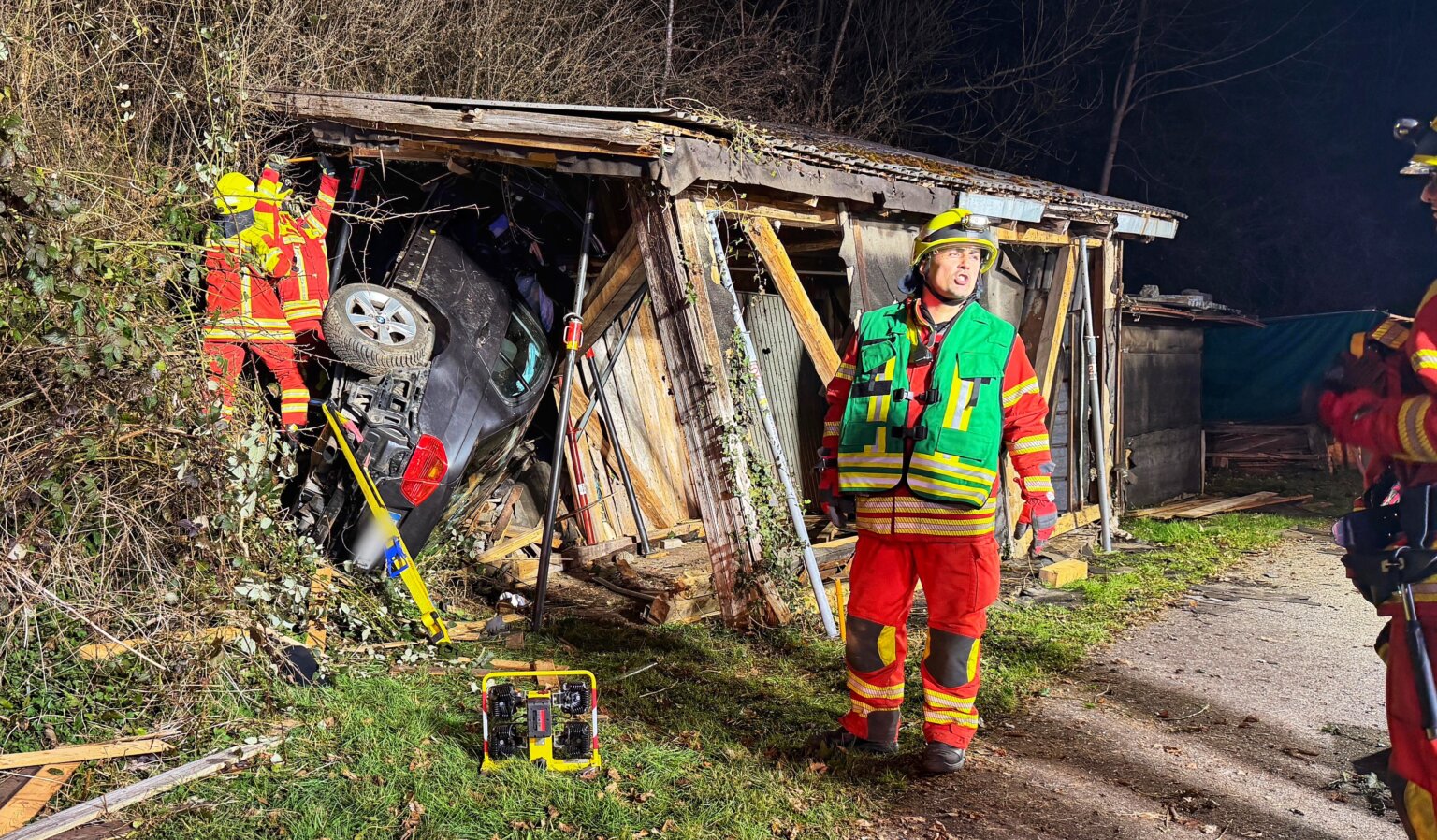 Das Fahrzeug – ein BMW – hat die Holzkonstruktion des Schopfes durchbrochen und liegt seitlich gekippt im Inneren des stark beschädigten Gebäudes. Die Wucht des Aufpralls hat die Holzwände des Schopfes erheblich deformiert; Balken und Bretter liegen verstreut auf dem Boden.