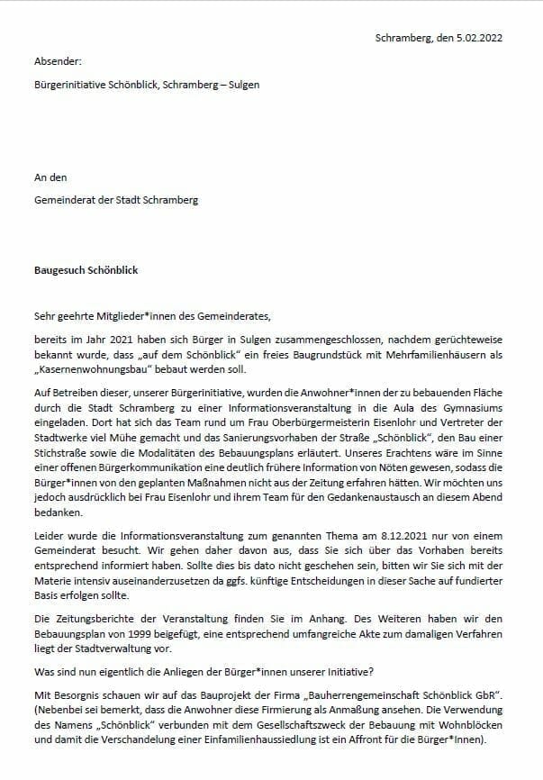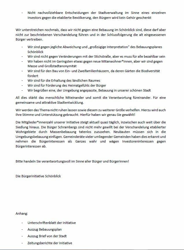 Man werde das Thema nicht ruhen lassen und bitte die angeschriebenen Rätinnen und Räte um Unterstützung. „Die Bürger Schrambergs sind nicht mehr gewillt, bei der Verschandelung etablierter Wohngebiete durch Massenbebauung tatenlos zuzusehen.“ Schließlich appelliert die Bürgerinitiative Schönblick.: „Bitte handeln Sie verantwortungsvoll im Sinne aller Bürger und Bürgerinnen!“