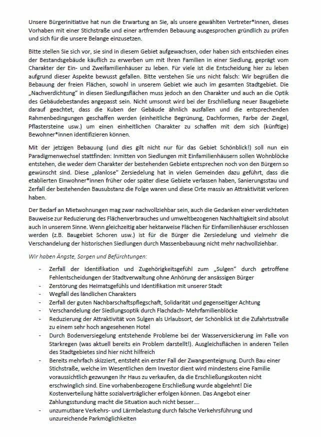 Bereits im Jahr 2021 hätten sich Bürger in Sulgen zusammengeschlossen, nachdem gerüchteweise bekannt geworden sei, dass „auf dem Schönblick“ ein freies Baugrundstück mit Mehrfamilienhäusern bebaut werden soll.