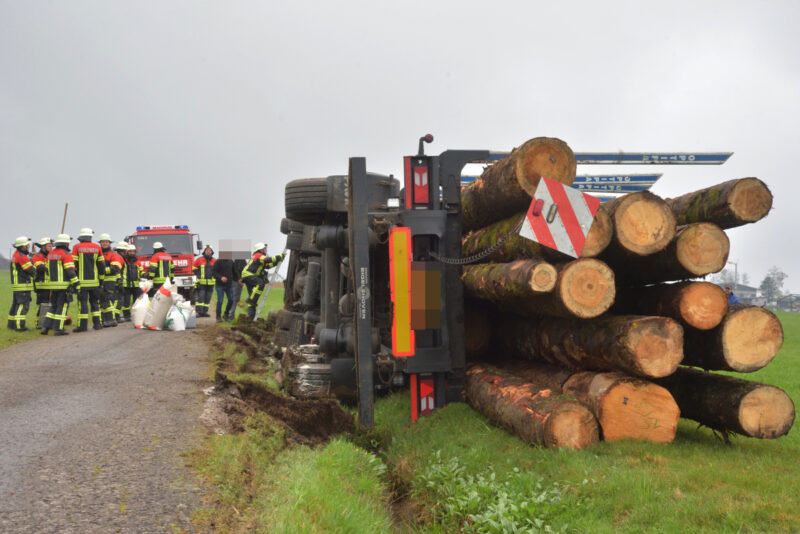 - Holzlaster stürzt um – etwa 80.000 Euro Schaden