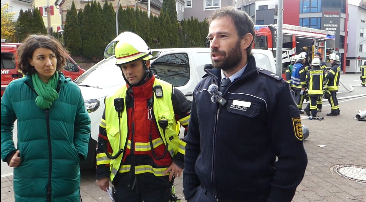 Für die Feuerwehr habe sich die Lage zunächst sehr unübersichtlich dargestellt: „Ein großes Trümmerfeld“, nannte Einsatzleiter und Stadtbrandmeister Patrick Wöhrle es. Rettungskräfte und Fachpersonal seien bereits vor Ort gewesen. Der LKW-Fahrer sei nicht im Fahrzeug eingeklemmt gewesen. Die Feuerwehr habe das Gebäude auf seine Statik überprüft. Man habe vorsichtshalber etwa ein halbes Dutzend Personen zunächst evakuiert. Das Gebäude sei aber nicht gefährdet.