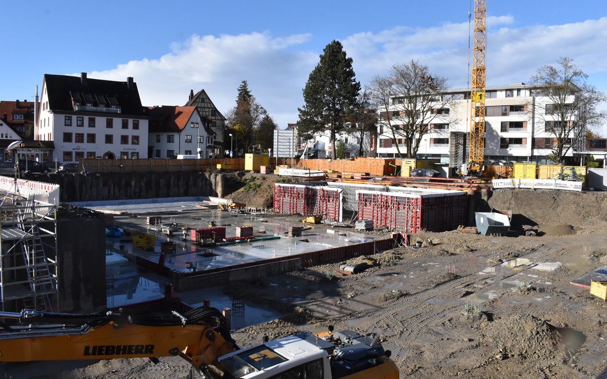 Rottweil – Ein symbolischer Spatenstich, das betonte Landrat Dr. Wolf-Rüdiger Michel in seiner Ansprache. Denn inzwischen sind die Abbruchsarbeiten fertig, der Bau hat begonnen. Schon sind die Bodenplatten zu sehen. Der Bau stehe „im Zeichen der Nachhaltigkeit und des verantwortungsvollen Handelns“, wie Michel sagte. Mit den verschiedenen Maßnahmen wie Eiskeller würden 60 Prozent der Energie eingespart, kündigte er an. Für das Gebäude werde das Gold-Zertifikat der DGNB (Deutsche Gesellschaft für Nachhaltiges Bauen) angestrebt.