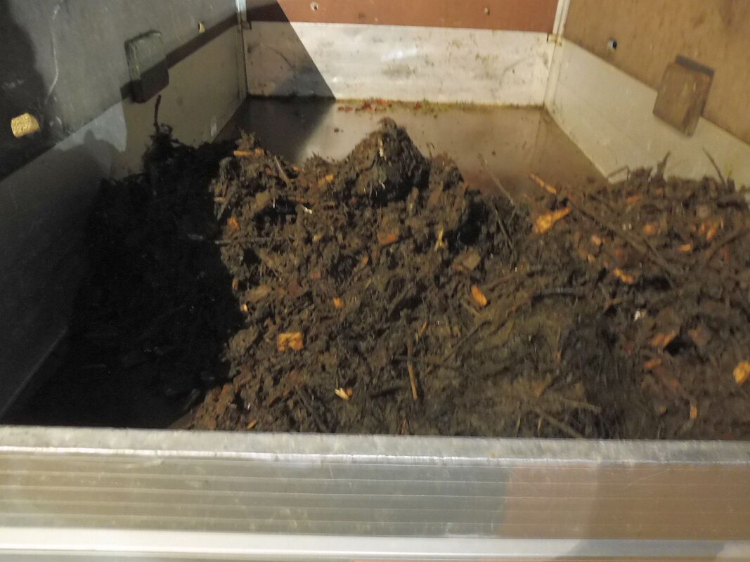 Mit einer Hacke haben sie den Nestbelag gelockert und mit einer kleinen Gabel in im Nest in einen Eimer gefüllt. Den Mist und Nestreste füllten sie Eimer um Eimer in eine kleine Tonne im Korb. Vier Mal ging es hinauf und hinunter Zum Schluss kamen dann die Holzhackschnitzel auf den Nestboden.