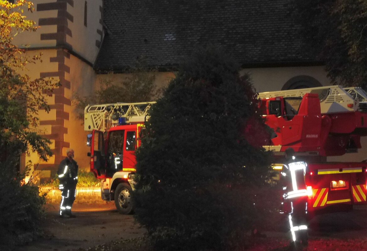 Sulz-Mühlheim. Die Sulzer Feuerwehr kam gegen 19 Uhr am Mühlheimer Kirchturm mit der Drehleiter und einem Mannschaftswagen zur Kirche in Mühlheim Fünf Maschinisten und ein Einsatzleiter waren bis 21.15 Uhr vor Ort.