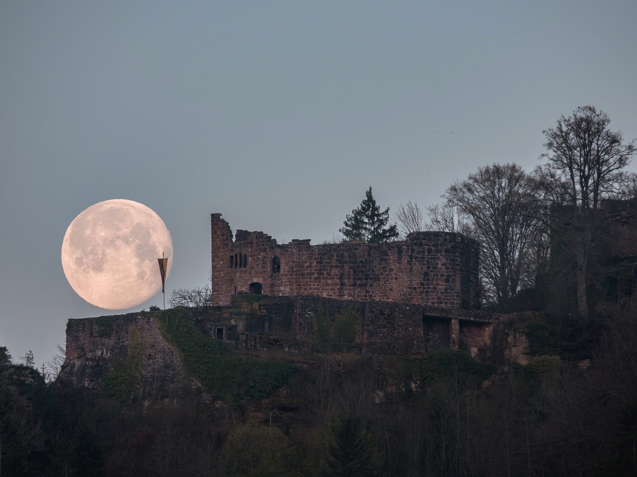 Der Supermond über der Hohenschramberg am frühen Dienstagmorgen. Während der Mond unterging, zeigte sich langsam die Sonne und legte die Burg in ein besonders sanftes Licht.