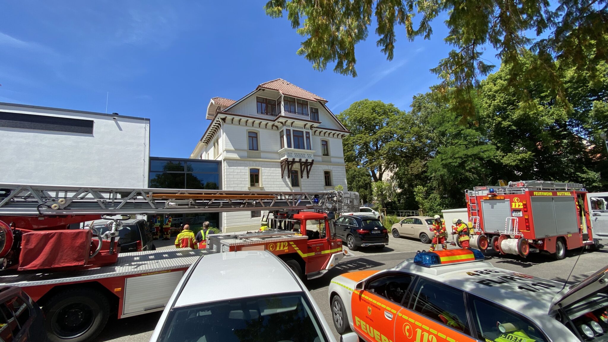 Zwei der Einsatzkräfte aus dem ersten Löschfahrzeug rüsteten sich mit Atemschutz aus, um gegebenenfalls eingreifen zu können. Die Drehleiter stand schon bereit. Unterdessen erkundeten Müller und weitere Feuerwehrleute die Lage. Und konnten dann rasch Entwarnung geben.
