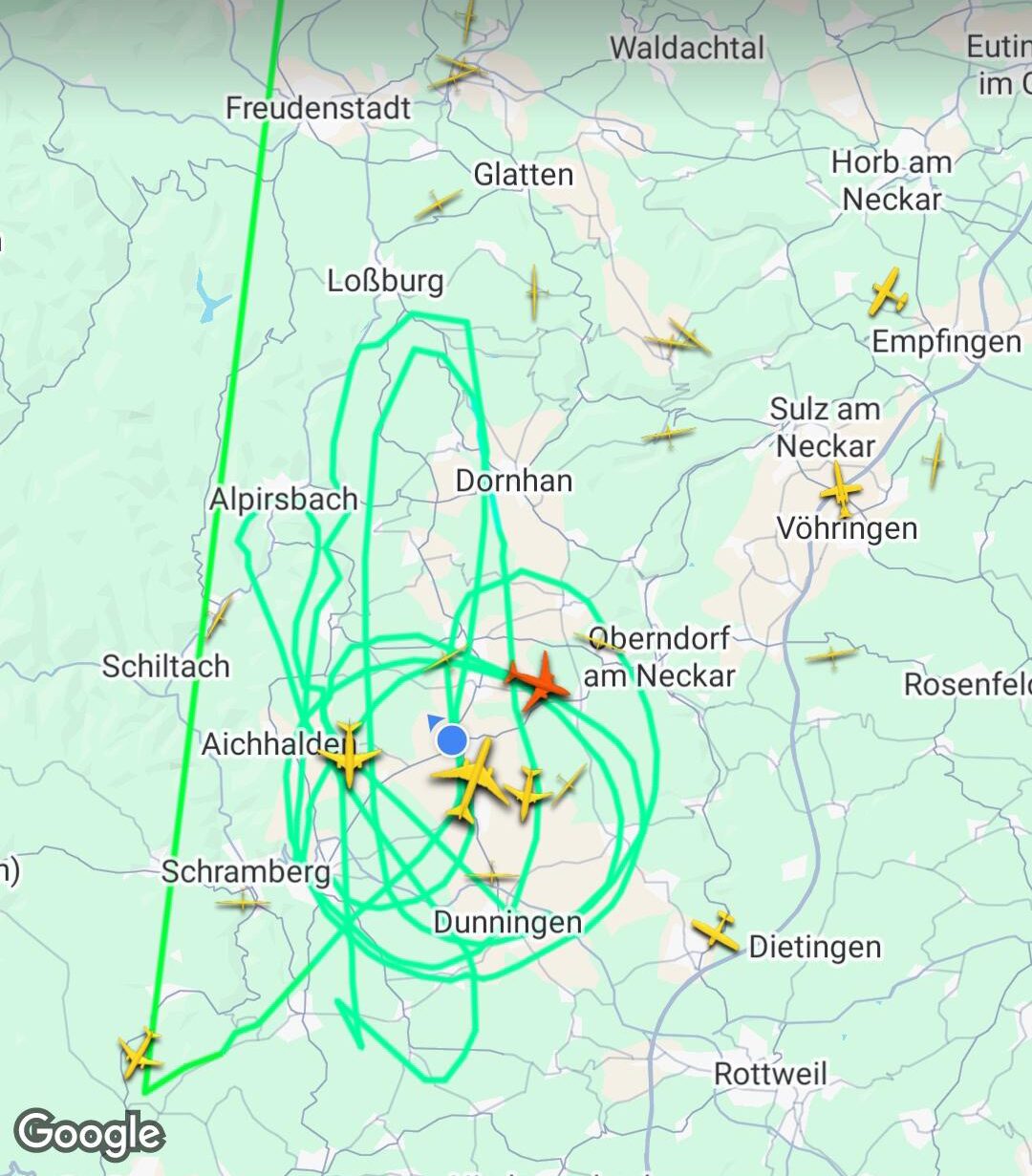 Es fiel einigen Lesern auf: Wer die beliebten sogenannten Flighttracker, Tools zur Echtzeitverfolgung von Flügen, mag, der stieß gestern auf ein ungewöhnliches Flugverhalten über Rottweil. Eine Maschine mit der Kennung „GHOST01“ – mit der sie jedenfalls in der App gekennzeichnet wird – zog Schleifen über Rottweil und Umgebung. So sah das aus; die grünen Linien kennzeichnen die Flugroute: