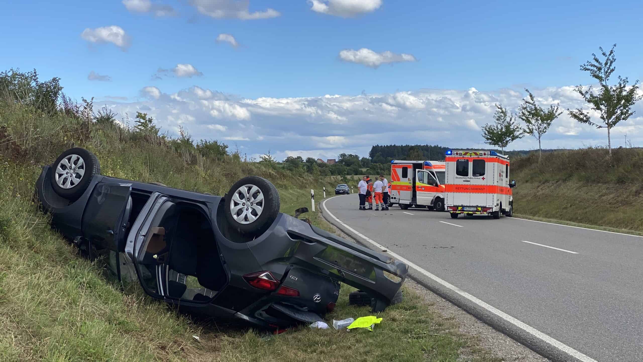 Während der Seat stark beschädigt noch auf der Bundesstraße zum Stehen gekommen ist, wies der seitliche Zusammenprall den anderen Wagen in den Graben ab. Dort überschlug sich der Hyundai, blieb auf dem Dach liegen.