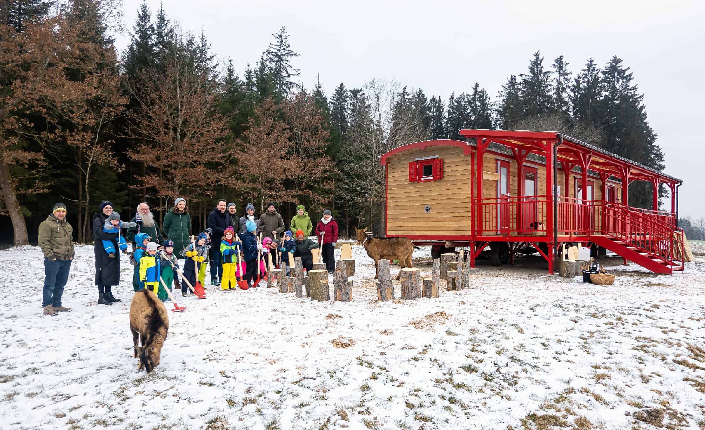 Mittwoch, 1. März, Gewann Eichen, gegen 7:30 Uhr stehen zwei Autos am Waldwagen 1, drei Autos am Wendeplatz links davon. Eine Frau schleppt mehrere Wasserkanister, Thermoskannen und Schachteln in den Wagen. Drinnen rückt eine andere Kindertische und -bänke zu einem Oval zurecht. Ein Bärtiger lässt zwei Ziegen aus seinem Auto springen. Aus den anderen Autos lassen Eltern ihre Kinder springen, dick eingekleidet, angesichts der minus 4 Grad. Als wüssten alle, wo’s lang geht, auch die Ziegen, zog die Karawane zum Waldwagen. Dort sind weitere Kinder mit ihren Eltern angekommen, ganz mutige sogar mit dem Fahrrad.
