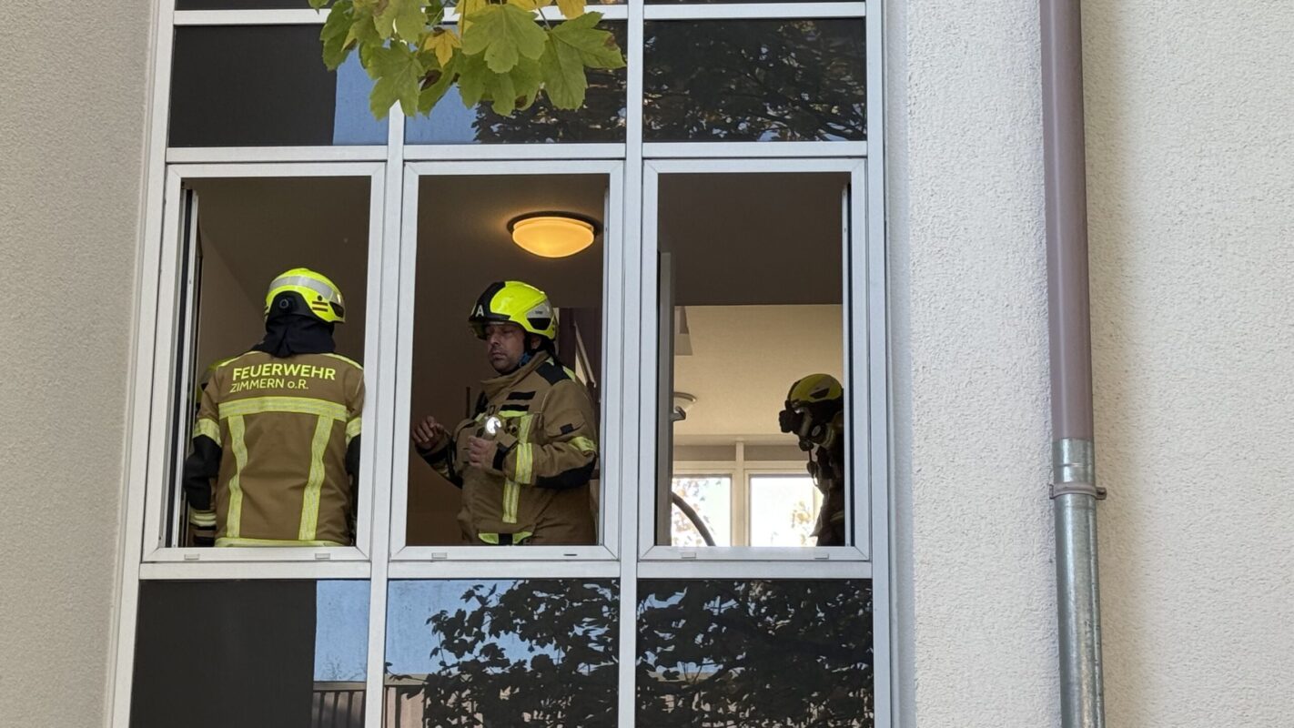Qualm drang aus rückwärtigen Fenstern, die Wohnungstür war warm: Die Einsatzkräfte der Feuerwehr Zimmern, die rasch vor Ort waren, mussten von einem Brand in der Wohnung ausgehen. Dieser brach in einem Mehrparteienhaus am Flozbrunnen aus. Einige Minuten lang hing die Frage in der Luft, ob in der Wohnung noch jemand sein könnte. Massiv drangen deshalb die Einsatzkräfte vor. Sie öffneten Türen, Fenster und einen Zugang zum Balkon mit Gewalt. Dies alles unter Atemschutz, da weiterhin eine starke Rauchentwicklung herrschte. Von draußen hatte sich die Mannschaft mit der Drehleiter aus Rottweil für einen Zugriff bereit gemacht.