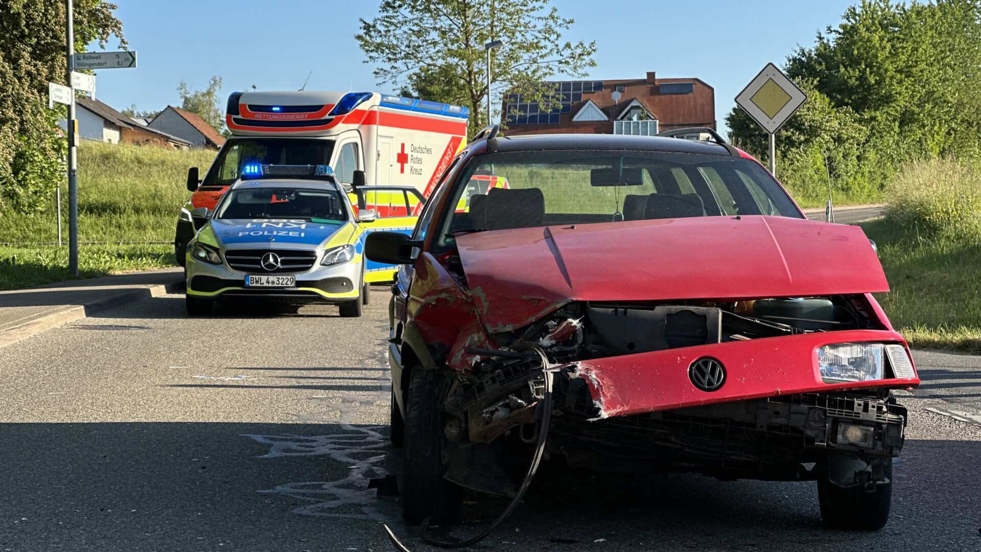 Zwei Fahrzeuge sind auf der Kreisstraße zwischen Dunningen und Bösingen heftig zusammengeprallt. Nach ersten Meldungen von Zeugen ging die Leitstelle von einem schweren Unfallbild aus und entsandte Rettungskräfte in großer Zahl. Darunter auch einen Rettungshubschrauber, der aber auf Anflug abdrehen konnte. Ein Notarzt, der organisatorische Leiter Rettungsdienst und drei Teams aus Rettungswagen kümmerten sich vor Ort um die Verletzten.