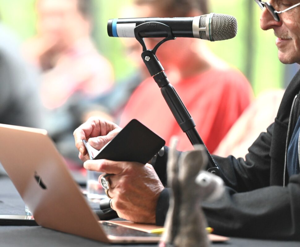 Zumindest einer hielt die Fackel des Greifbaren noch hoch: Der deutsch-spanische Lyriker und Essayist José F.A. Oliver, dem der Zieleinlauf der Textparade zukam. Er ließ zunächst mit einem Rottweiler Miniatur-Esel charmant die Herzen höher schlagen. Und nach seinen eigentlichen, vom Laptop rezitierten Zeilen, zückte er für ein Kurzgedicht noch ein Notizbuch. Kein Anruf, kein digitales Zuflüstern. „Das Gedicht ist – ein Narrensprung“, verlas er vom Papier. Applaus. Und over. Oder?