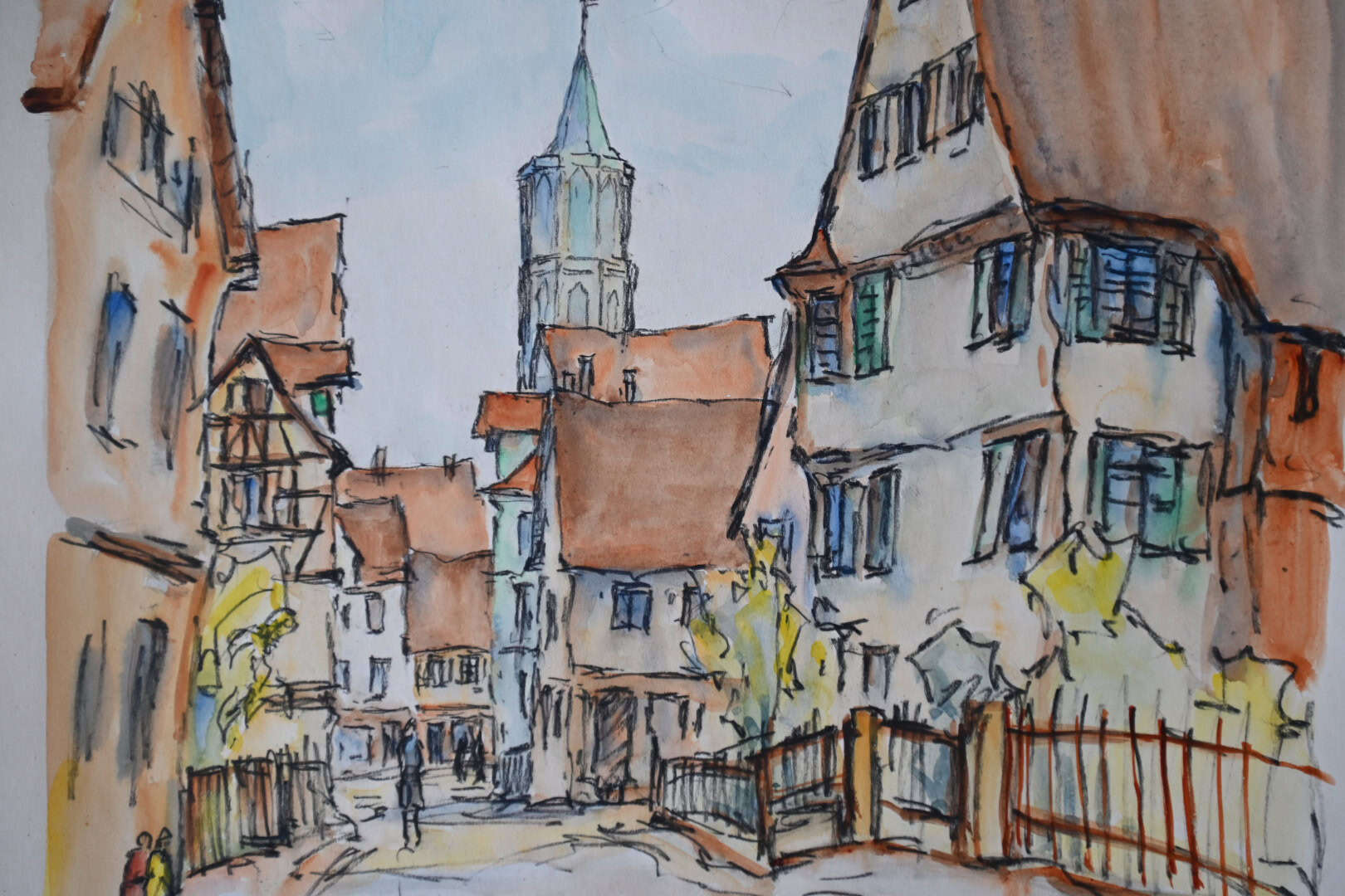 Es ist bereichernd, die Vielfalt an Perspektiven und Stilen auf sich wirken zu lassen, die hier nebeneinander stehen: Mal ist es eine kantige Zeichnung, die den Rhythmus der Giebel und Gauben erfasst. Mal ein duftig-leichtes Aquarell, das eine Gasse im Frühlingslicht erglänzen lässt, mal wird kühn eine Szene in groben Pinselstrichen gebündelt.