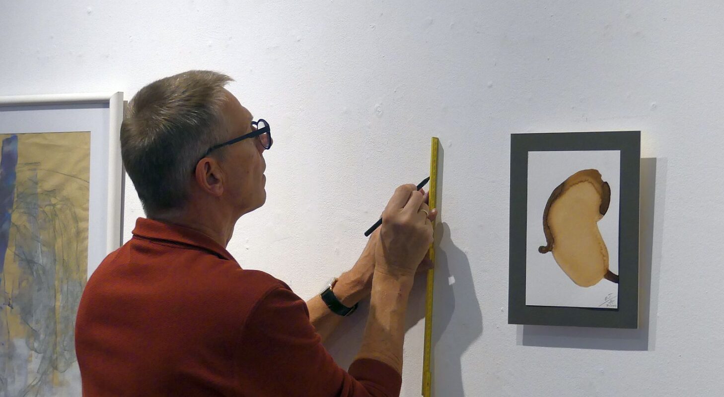 Die Vielzahl der unterschiedlichen Kunstwerke in den drei großen Räumen im Schramberger Schloss so zu platzieren, dass es ein harmonisches Ganzes gibt, hat den Akteuren einiges Kopfzerbrechen bereitet. Nun geht es um die letzten Hängungen. Ein Hinterglasbild wird am Fenster aufgehängt und kommt so zur Geltung. Für vier kleine Bilder aus einer Serie misst Andi Krause genau die Abstände und klopft dann Nägel in die Holzwand.