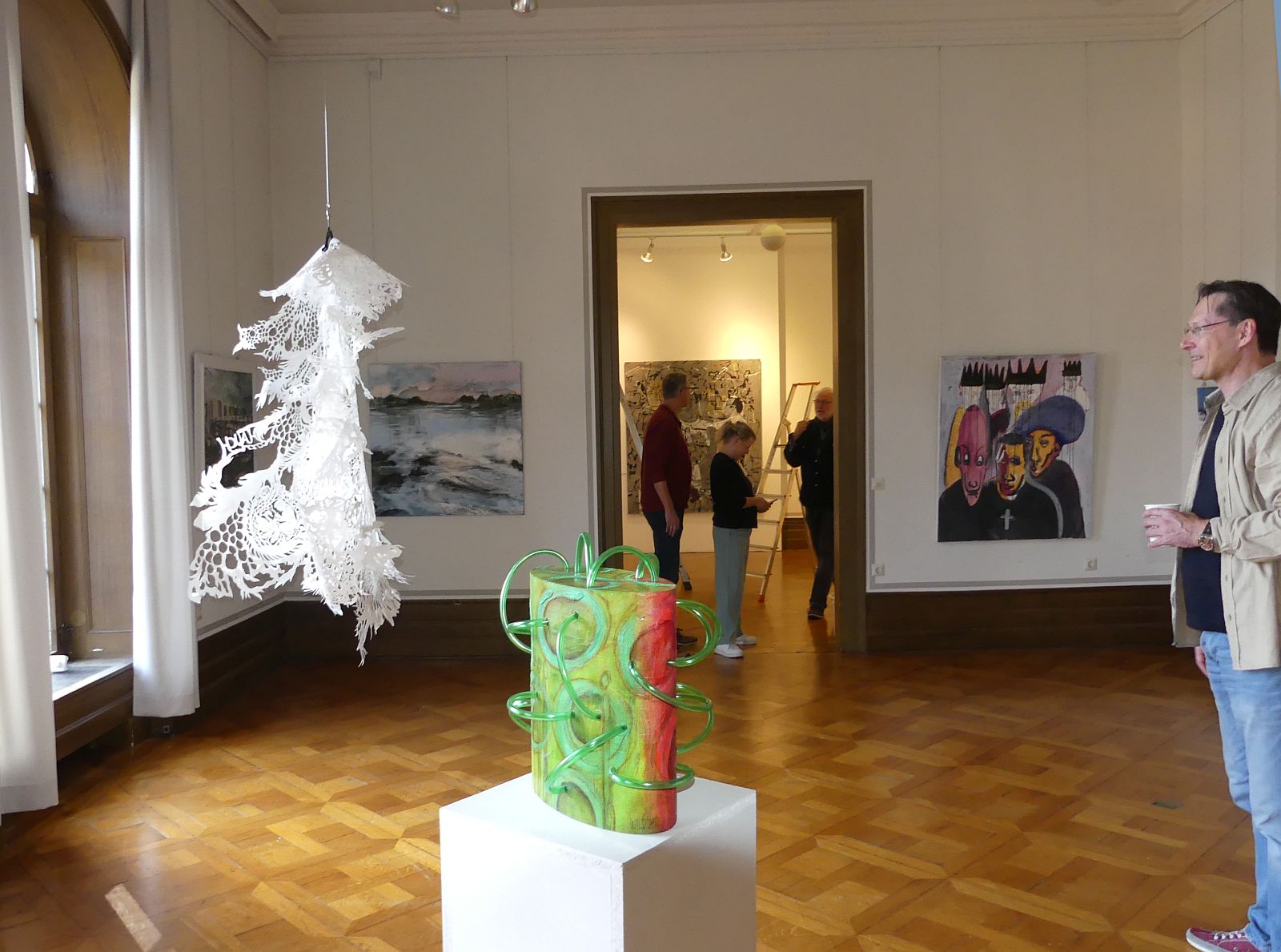 Schramberg. „Alle Formate, alle Techniken, alle Materialien“ seien vertreten, so der Vorsitzende von Podium Kunst Lars Bornschein. „Die ganze Bandbreite.“ Gemeinsam mit seinen Vorstandsmitgliedern Miriam Huschenbeth, Andreas Krause und Rémy Trevisan war Bornschein im Schloss dran, die Bilder und Plastiken an der richtigen Stelle zu platzieren.