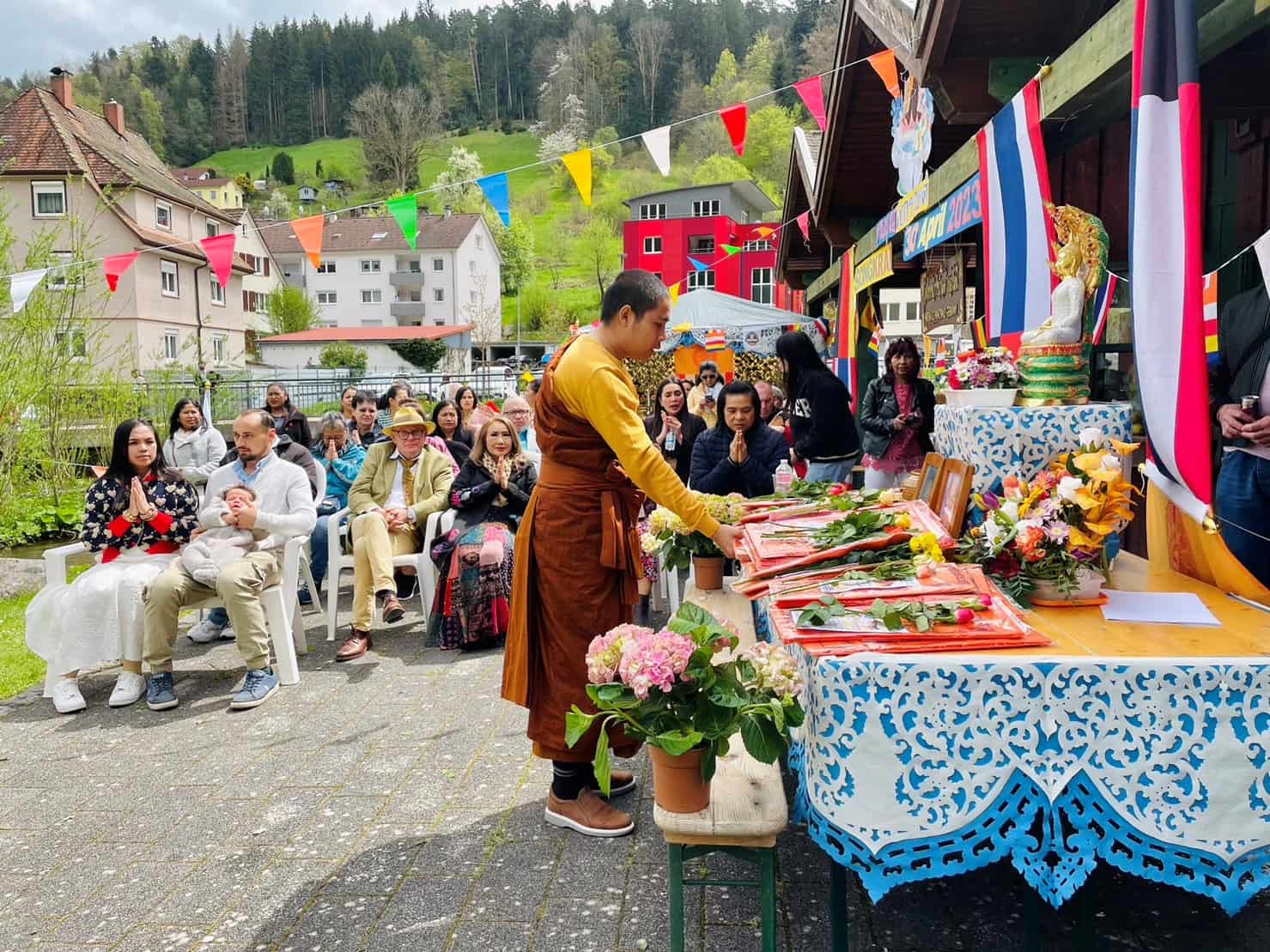 Schramberg. Bunte Fahnen schmücken seit einigen Wochen ein Mehrfamilienhaus an der Wernerstraße in Schramberg: Eine Aufschrift mit einer Buddha-Figur zwischen Tannen vor hohen schneebedeckten Bergen verkündet „Watthai Schwarzwald Germany“. Dahinter verbirgt sich eine kleine buddhistische Gebetsstätte für Menschen mit thailändischen oder laotischen Wurzeln.