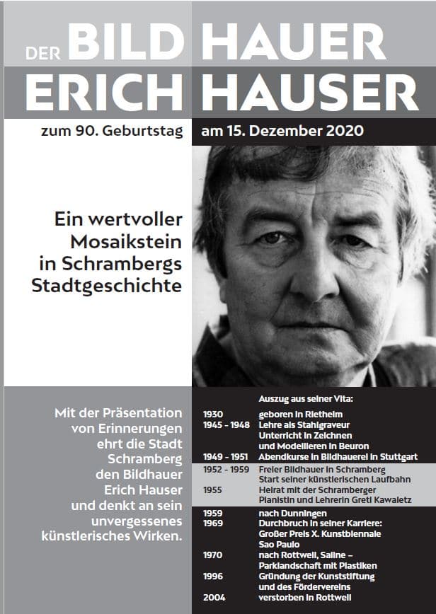 Am 15. Dezember wäre der Bildhauer Erich Hauser 90 Jahre alt geworden. Aus diesem Anlass waren eine Reihe von Ausstellungen, Führungen und Veranstaltungen geplant. Doch wegen der Corona- Pandemie mussten die Organisatoren fast alles absagen. Arnhold Budick hat eine Reihe von Zeitungsartikeln zu Hausers Wirken in seiner Schramberger Zeit in den 50er Jahren verfasst. Viele Spuren hat der später in Dunningen und dann in Rottweil lebende Hauser in der Stadt hinterlassen.