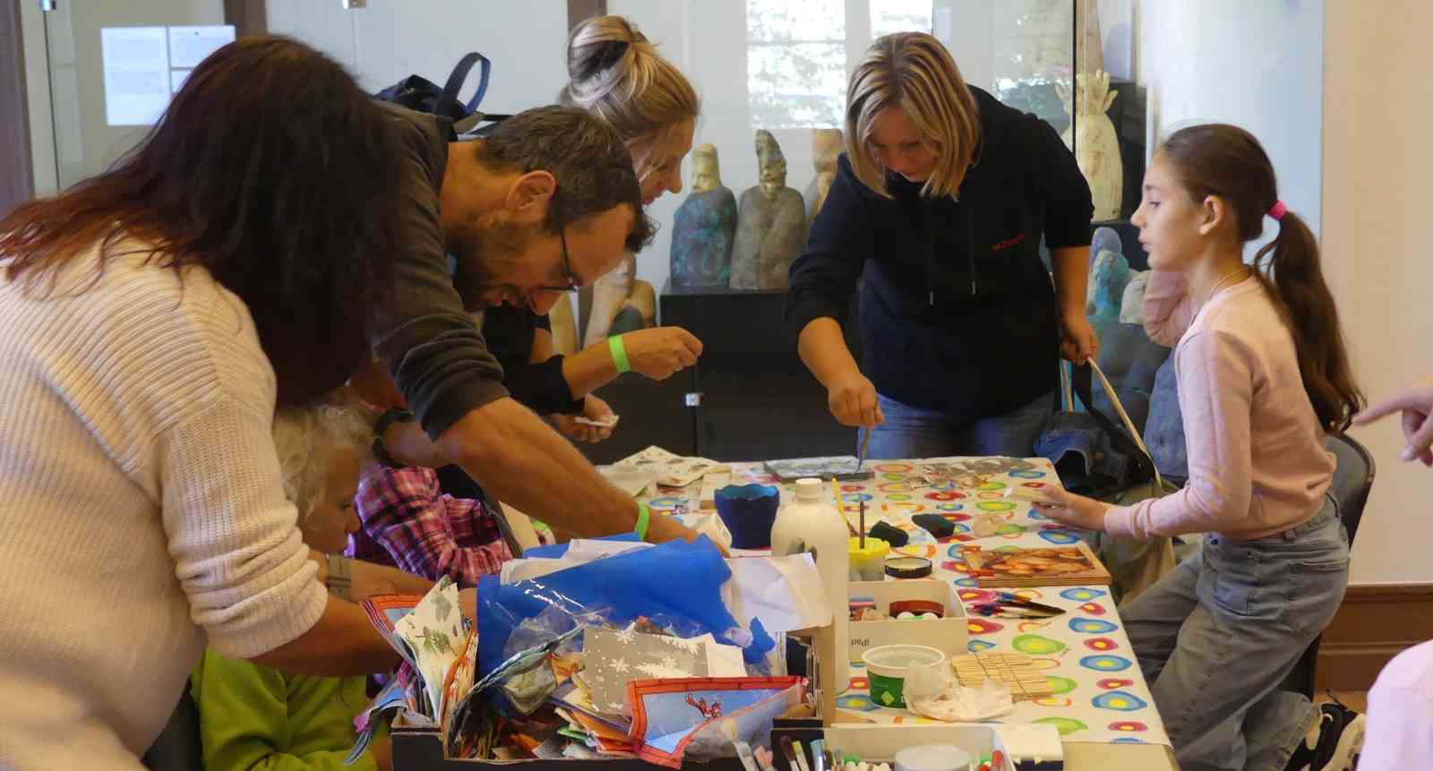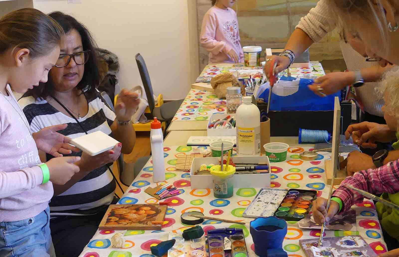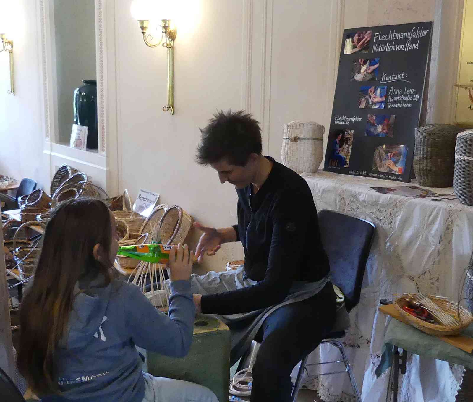 In einem Ausstellungstraum bemalten Kinder mit ihren Eltern Holzplatten, im Flur wurde gefilzt. Im Foyer des Schlosses haben sich drei Leute der Flechtkunst gewidmet. Körbe und Sterne aus Weide. Urnen aus Peddigrohr.