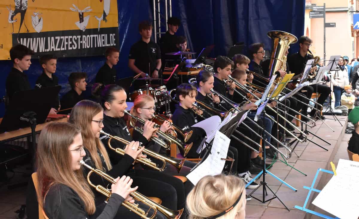 Nach vier Jahren endlich wieder Jazz in Town in gewohnter Form und ohne Einschränkungen, freute sich Busch vor gut über 200 Zuhörern. Ruf sprach seinen Dank aus an Busch, seinen Mitstreiter Claus Gams und alle die anderen Helferinnen und Helfer, die das Fest erst möglich machen. Er wünschte dem Fest, dass es nicht regnen möge. Und er stellte das traditionell zuerst auftretende Ensemble vor, die 70-köpfige Jugendkapelle der Stadtkapelle unter „Stadtmusikdirektor“ Johannes Nikol – dem ganz offiziell dieser Titel erst am 10. Mai verliehen werden soll, wenn der Gemeinderat zustimmt.