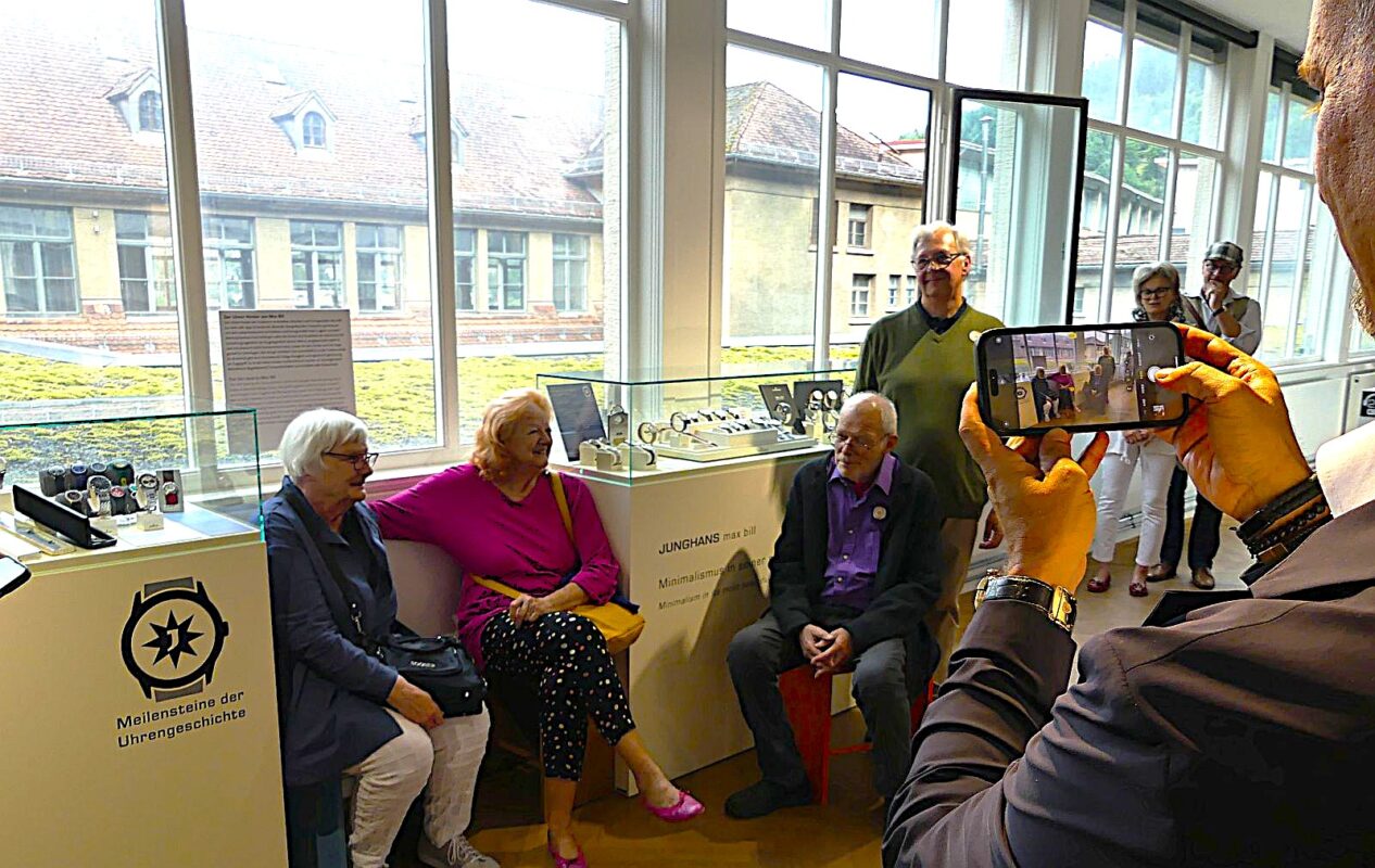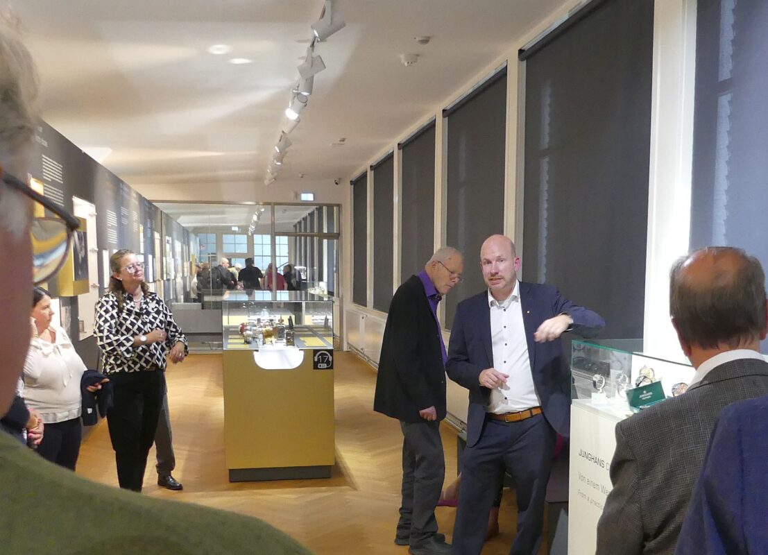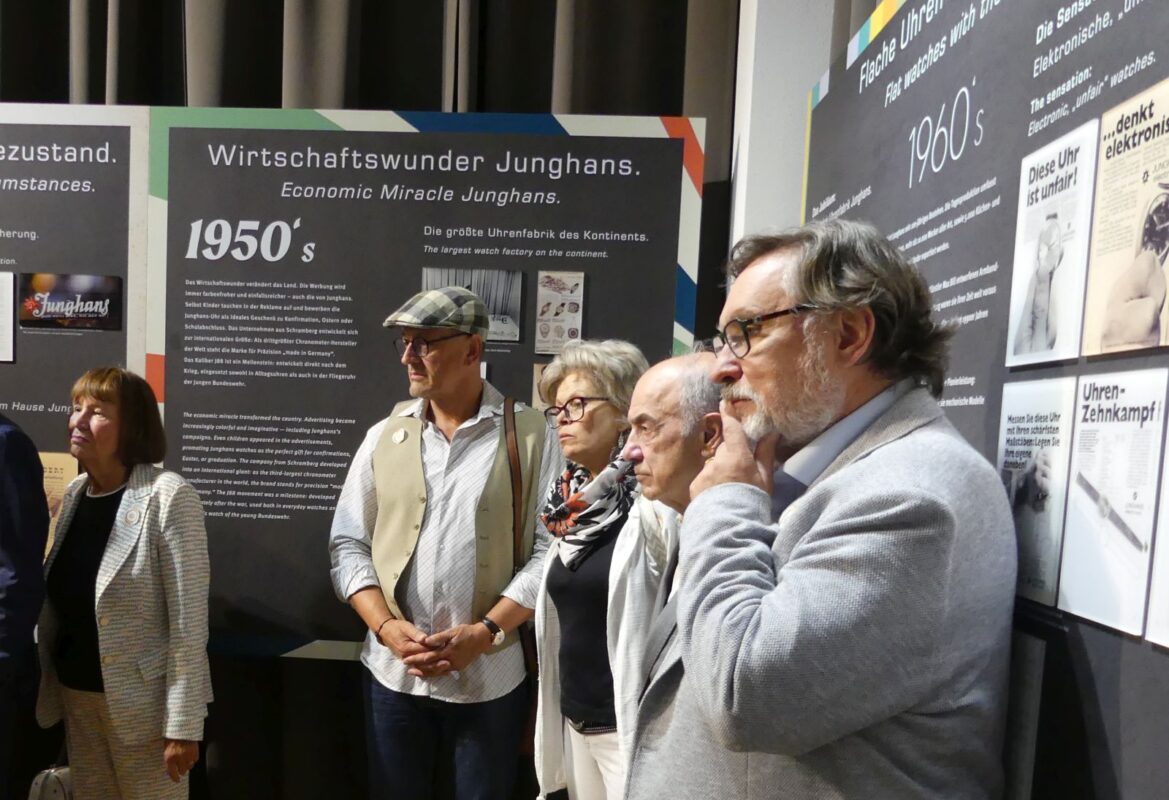 Bei einem Rundgang erläuterte Steim seinen Gästen diese Entwicklung: Von der ersten Junghans Armbanduhr aus dem Jahr 1927, einer „Nobrk“, Nicht-Brechbaren für den US-Markt über die Chronometer, Pilotenuhren und die ersten Quarzuhren wie der Mega 1 bis zur Octopus für die Hongkonger U-Bahn und die heutigen Funksolaruhren oder die mechanischen Uhren der Meister-, Max-Bill- und Erhard-Junghans-Reihen.