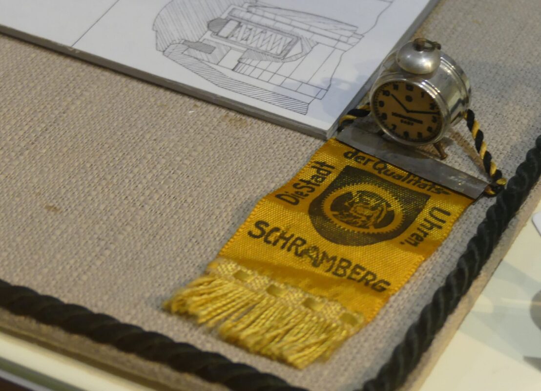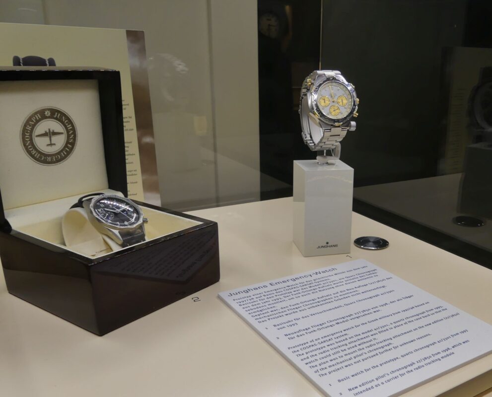 Auch Kuriositäten hat Ausstellungsmacher Grünberger zusammengestellt. So zeigen die heutigen Inhaber der Uhrenfirma Hans-Jochem Steim und Hannes Steim ihre seit der Kindheit geschenkten oder gekauften Junghans-Uhren. Zu sehen ist auch der Prototyp einer „Rescue-Uhr“ für die griechische Armee, die aber nie in Serie ging.