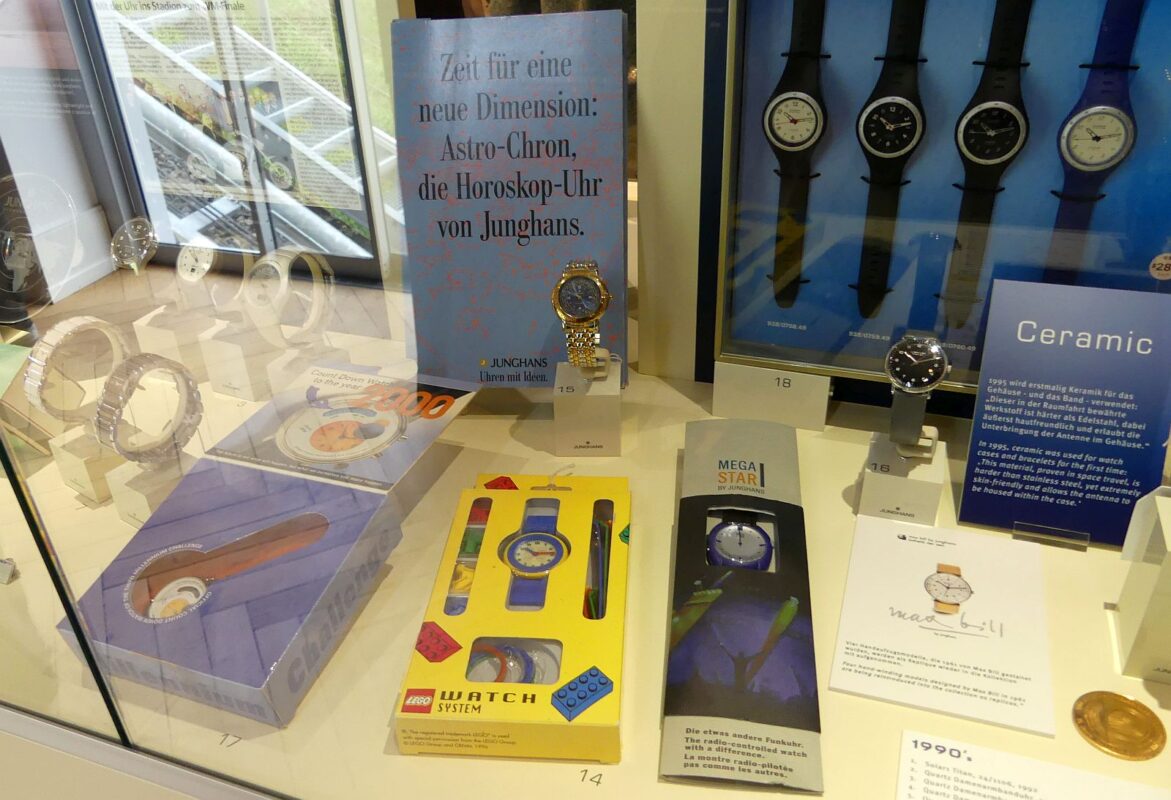 In den Räumen des Terrassenbaumuseum sind auf zwei Ebenen Vitrinen mit Junghansuhren nach Themen sortiert zu sehen. Hier finden sich beispielsweise Werbeuhren oder besondere Schmuckuhren. Manche davon waren mit Brillanten besetzt oder mit klotzigem Uhrengehäuse aus Platin. Diese hätten in gewissen Kreisen für besondere Aufmerksamkeit gesorgt, wie einer der damaligen Designer, Udo Schultheiss, beim Rundgang anmerkte.