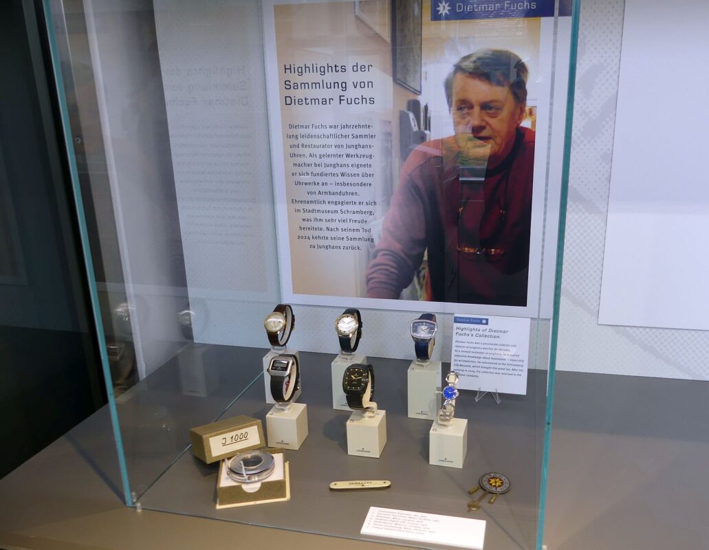 In einer eigenen Vitrine erinnert die Ausstellung an den Sammler Dietmar Fuchs. Sein Sohn Frank erzählt dazu: „Mein Vater hat alles gesammelt, worauf Junghans stand.“ Steim fügt hinzu: „Das gesamte Dachgeschoss war voll mit Junghans-Material.“ Dies ergänze nun die eigene Sammlung, viele Lücken würden so gefüllt.