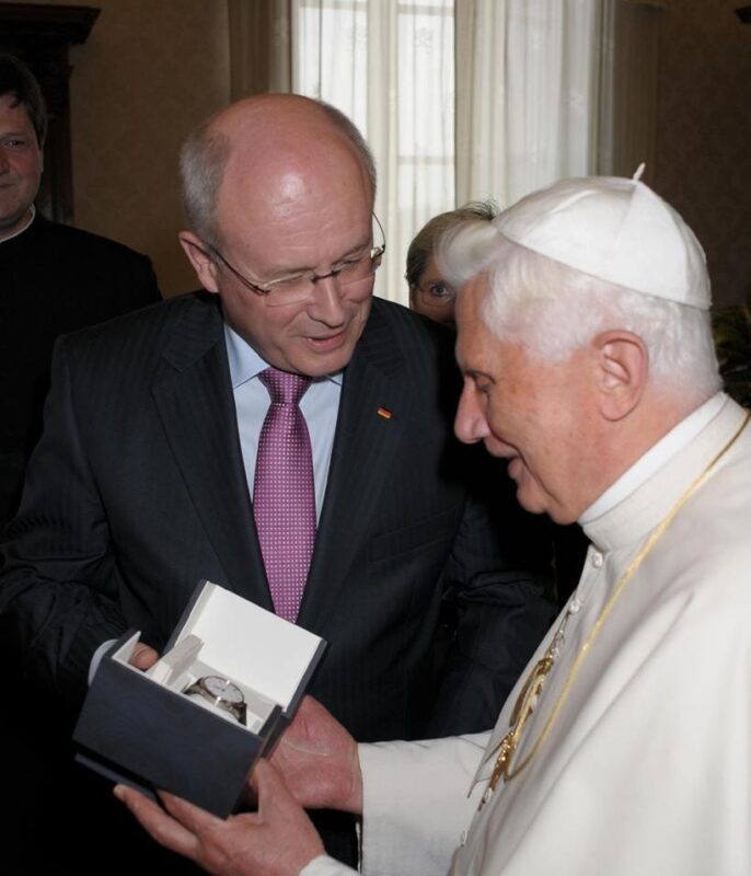 Auf einem Bild ist auch Papst Benedikt XVI zu sehen, dem der damalige Bundestagsabgeordnete Volker Kauder eine Junghans-Uhr schenkt, erzählt Steim. Der Papst habe das Geschenk entgegengenommen. Benedikt habe aber Kauder erklärt, er werde die Uhr nicht tragen. Er trage nämlich schon seit den 7o0er Jahren eine Junghans-Uhr, die ihm seine Schwester geschenkt habe.