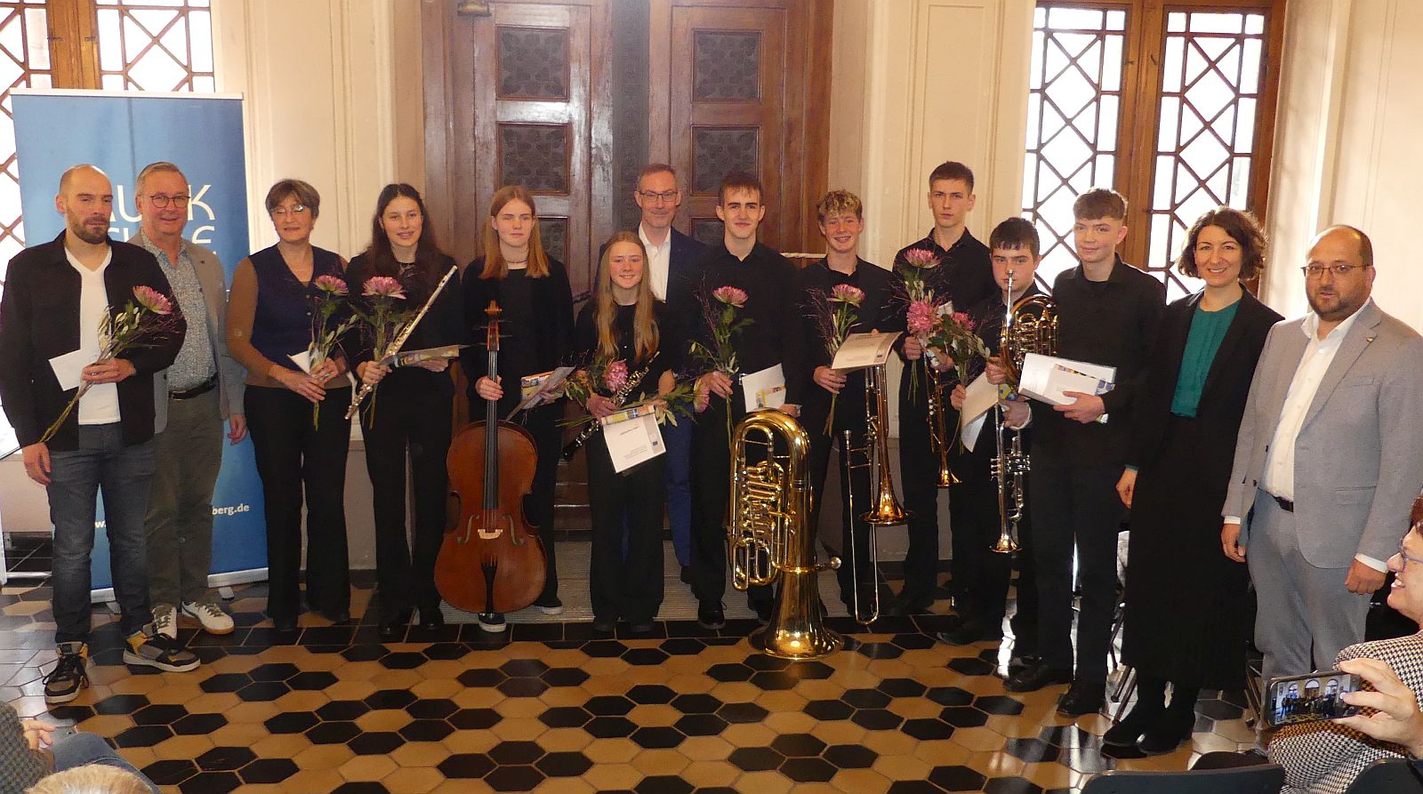 Nach der Übergabe der Preise durch Jörg Roscher und Thomas Herzog – von Musikschulleiter Meinrad Löffler gabs noch eine besondere Blume -, lud Herzog noch auf ein Glas Sekt oder Orangensaft ein.