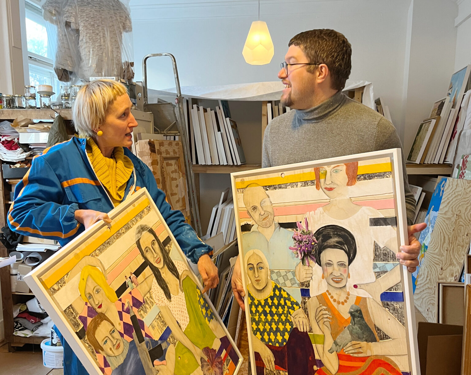 Vorab besuchte Johannes Waldschütz, Stabsstellenleiter Archiv, Kultur, Tourismus im Landratsamt, die Künstlerin in ihrem Atelier. Gemeinsam wählten sie die Werke für die Ausstellung aus. Eindrücke und Fotos aus diesem Besuch vermitteln einen direkten Blick hinter die Kulissen der kreativen Arbeit.