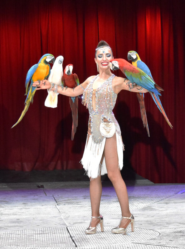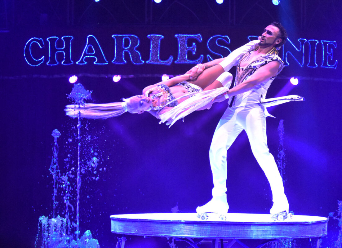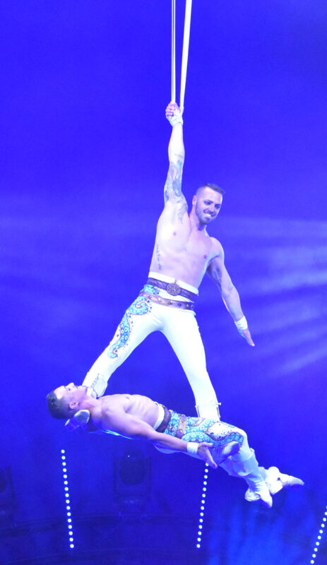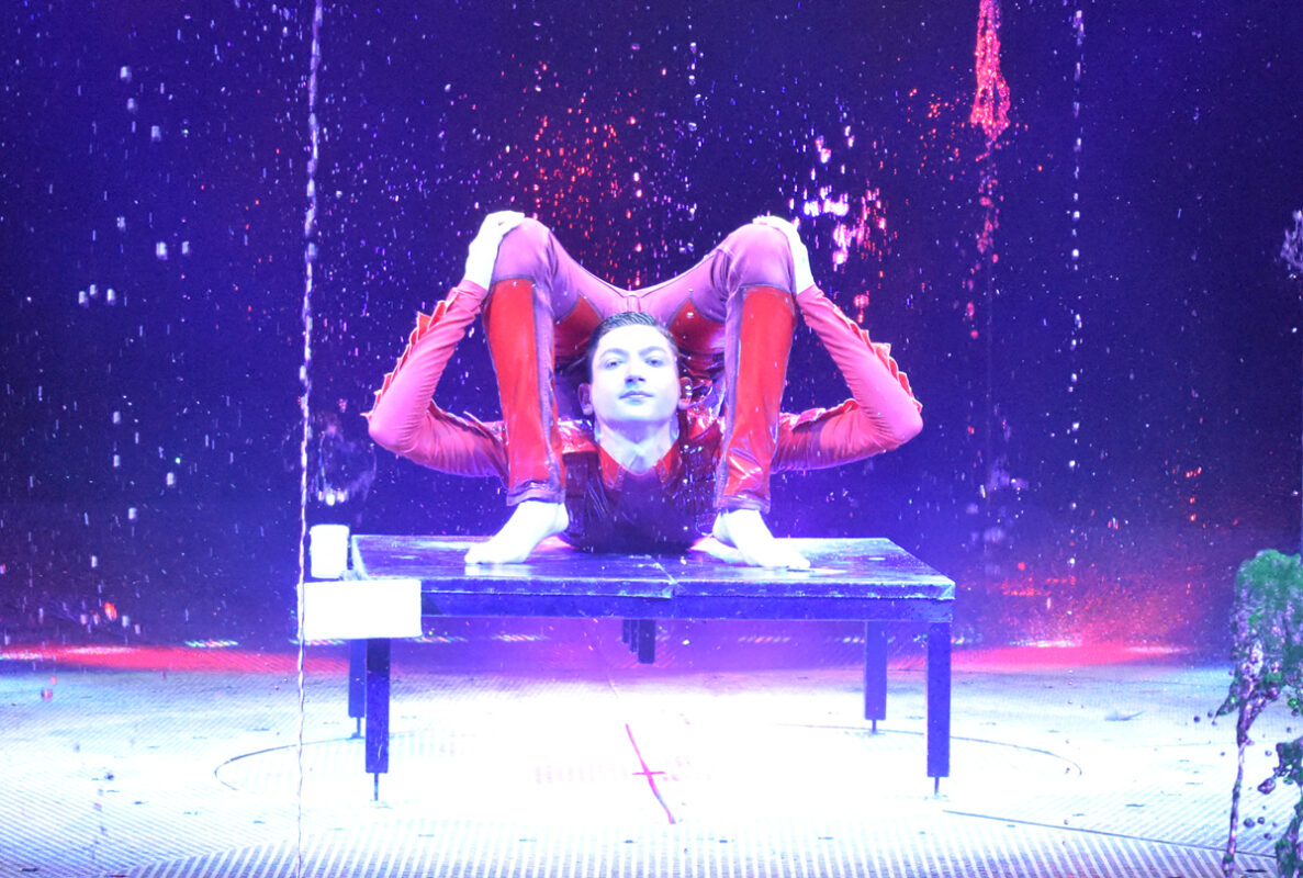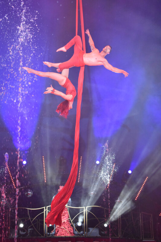 Viel Wasser war im Spiel – wie auch der Name der Show „100.000 Liter Emotionen“ schon sagt. Okay: Es sind zwar nicht 100.000 Liter oder 100 Kubikmeter Wasser in den Tanks unter der Manege. Aber die 30.000 Liter laufen drei Mal durch die Rohre, wie Zirkusdirektor Sascha Melnjak verriet.