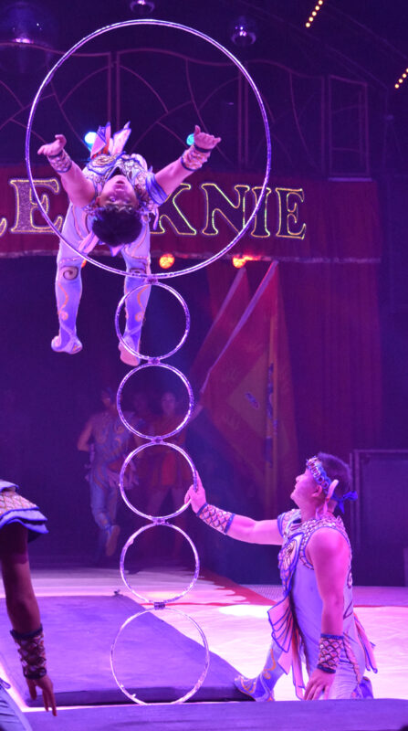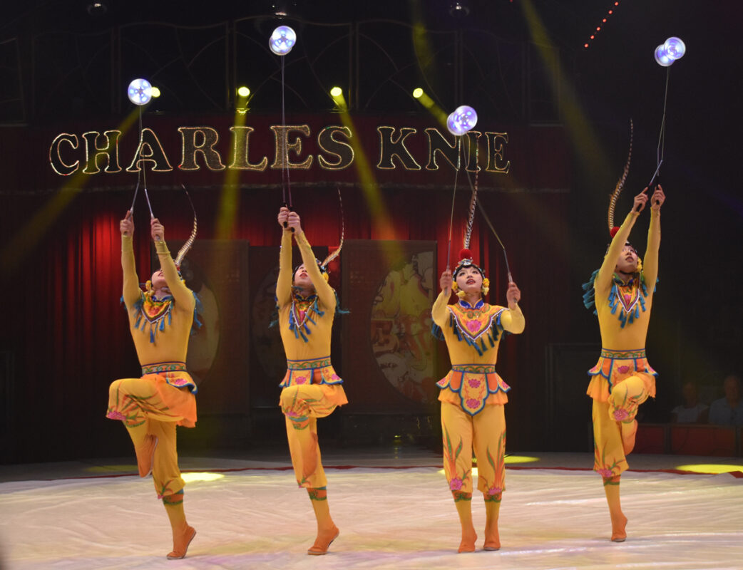 Die Abfolge in Form einer Revue, ohne lange Pausen dazwischen, ließ kaum Verschnaufpausen für die Zuschauer. Und wenn es mal einen Umbau gab, kam Clown Micael ins Publikum und gewann so schnell die Sympathie im Zirkusrund. Die Klima-Anlage hatte bei den heißen Außentemperaturen, den vielen Zuschauern und den vielen Lichtquellen eine Menge zu tun – aber es wurde nie zu heiß.