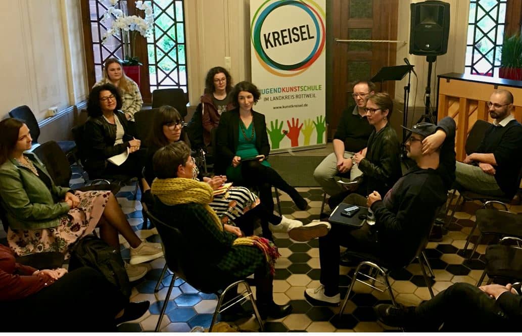 Unter dem Motto „Räume (er)finden zwischen Enge und Weite – Kreative Bildung und lebendige Jugendkultur in ländlichen Räumen“ diskutierte Dorothee Eisenlohr mit den Kreativen Anne Hess und Ira Hugger, Rob Hak und Thomas Kuhner sowie Menja Stevenson vom Landesverband der Jugendkunstschulen. In Vertretung des erkrankten Bernhard Rüth moderierte Jugendkunstschulleiterin Verena Boos die Veranstaltung.
