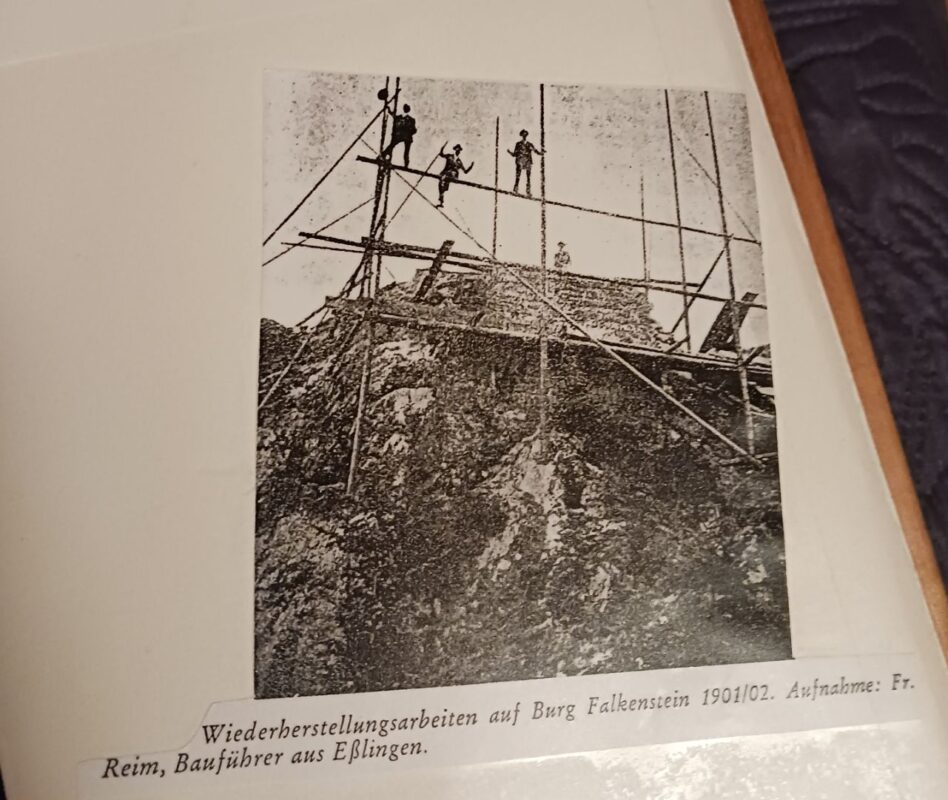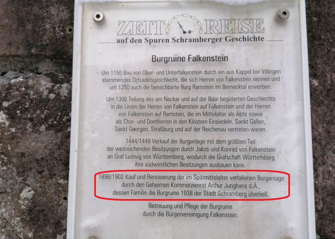 In der Tat hatte Arthur Junghans nach seinem Kauf der beiden Burgen 1899 diese in den Jahren 1900 bis 1901 wieder aufbauen lassen. Dabei ließ der Schramberger Uhrenkönig sich vom damaligen Landeskonservator beraten. Ziel sei gewesen, die überwachsenen Mauerreste und Mauerzüge freizulegen und einen Grundriss der gesamten Falkensteiner Burganlage herzustellen, wie Stadtarchivar Carsten Kohlmann schreibt.