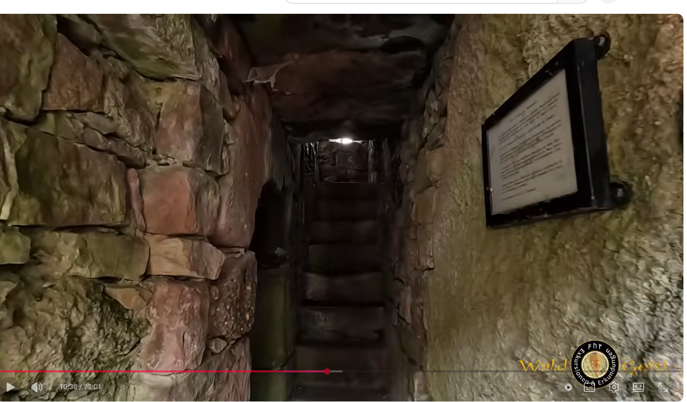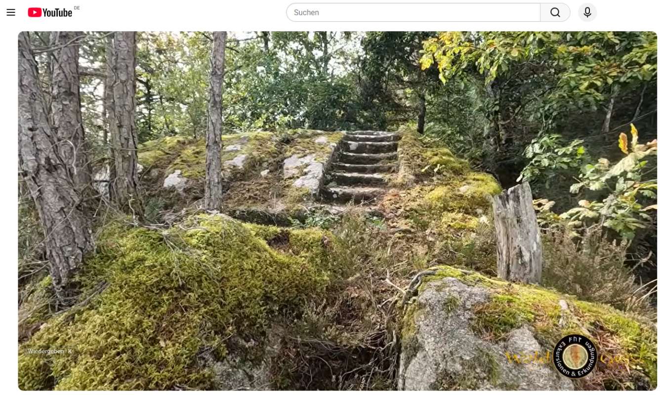 Die sind für ihn der Beweis, dass vor dem Bau der beiden Burgen hier bereits Menschen gelebt haben. „Das zeigt eine megalithische Treppe“, kommentiert der Waldgeist ein Bild einer der in den Fels geschlagenen Stufen, auf dem Weg von der unteren zur oberen Burg. „Wie aus dem Fels geboren, führen die Stufen scheinbar ins Nichts“, hört man ihn aus dem Off.