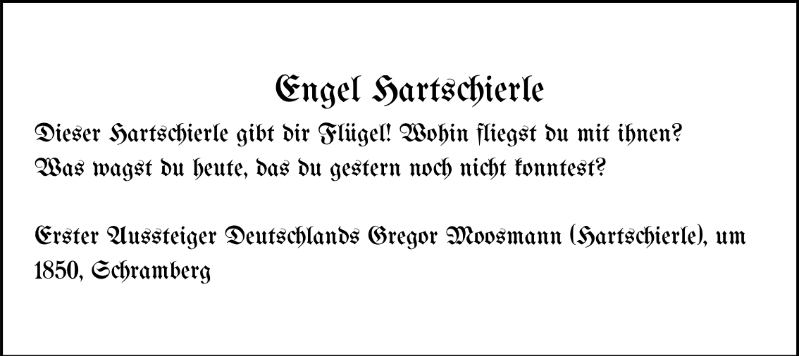 Die Figuren basieren auf den Originalen von Gregor Moosmann (1801–1872), genannt „Hartschierle“. Er war Schrambergs erster echter „Aussteiger“. Während unten im Tal die Industrialisierung begann, malte er in seiner Einsiedelei (der Moosmannshöhle) hunderte von filigranen Figuren – eine idealisierte, romantische Gegenwelt als Antwort auf die harte Realität.