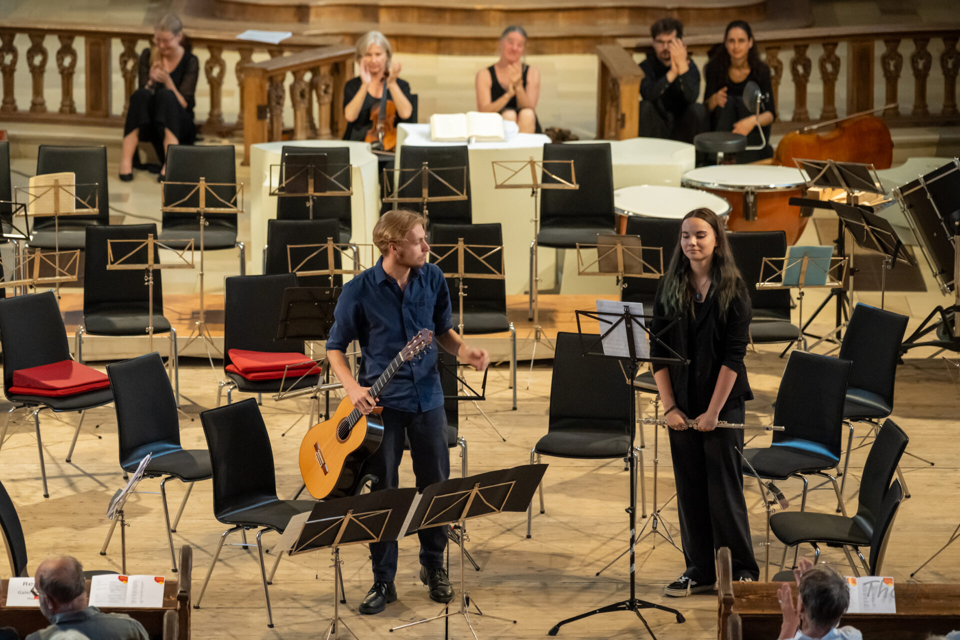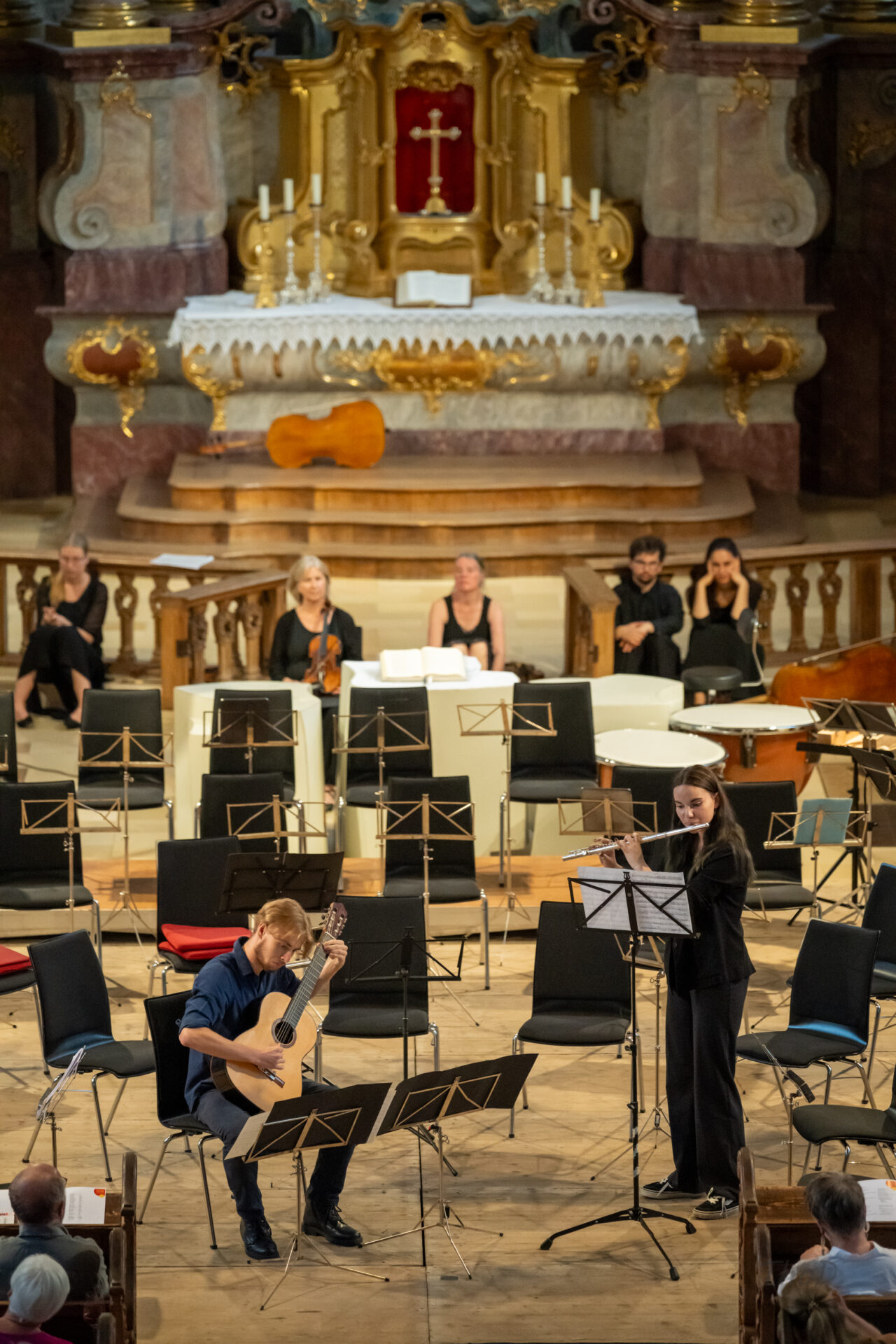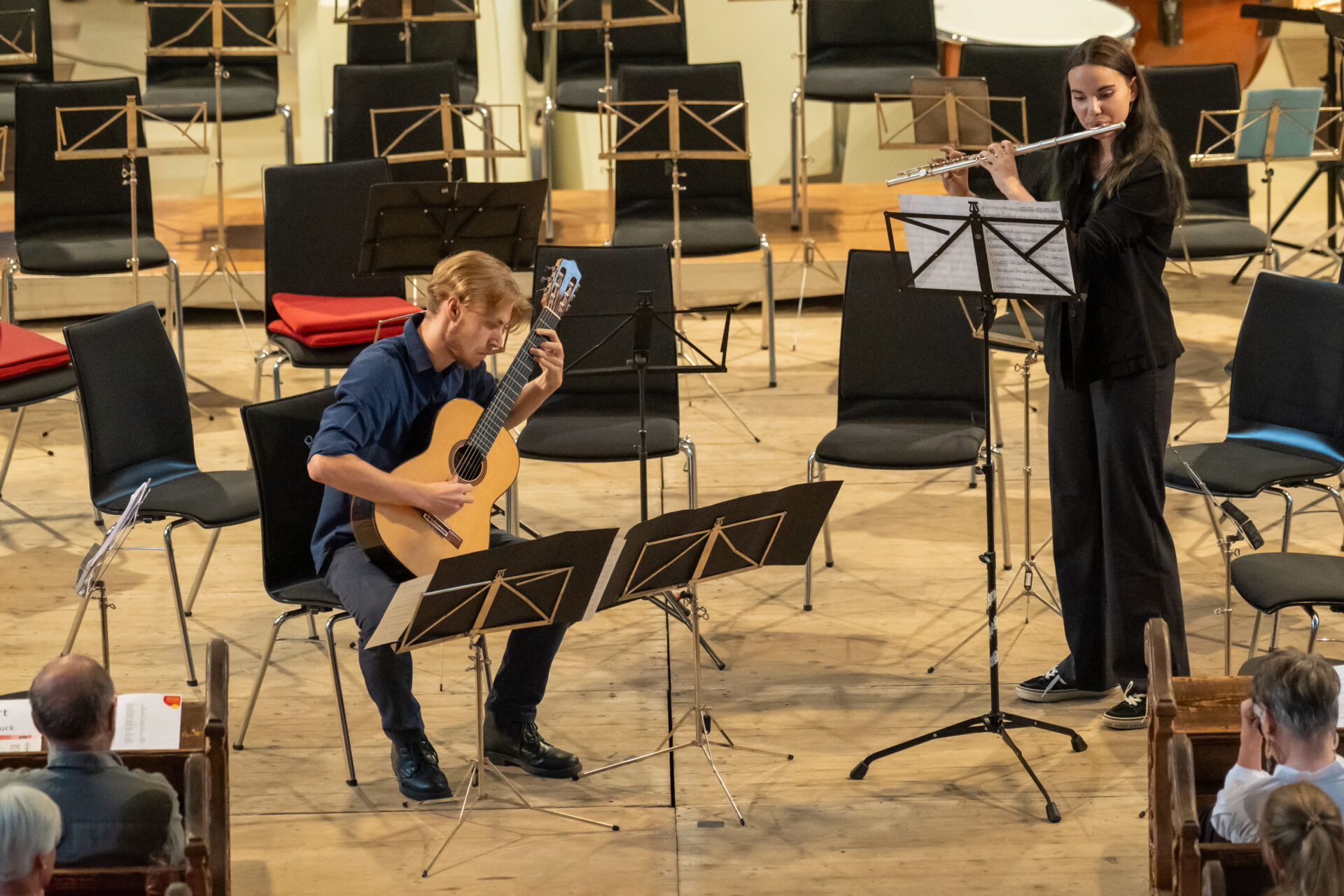 Zwei junge Preisträger aus der Städtischen Musikschule, Lina Götz an der Querflöte und Florentin Lorenz an der Gitarre, präsentierten im Anschluss Jacques Iberts (1890-1962) Duo „Entr´acte“. Der französische Komponist schrieb das quirlige Stück, eine launige Caprice, für die beiden Instrumente, die er besonders liebte.
