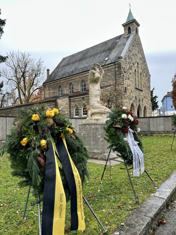 Am Ende der Feierstunde legten Oberbürgermeister Dr. Christian Ruf und Stadtrat Ralf Armleder für die Stadt Rottweil, Vertreter der Ortsgruppen des Volksbundes Deutsche Kriegsgräberfürsorge und des Sozialverbands VdK sowie der Reservistenkameradschaft Rottweil-Oberndorf Kränze am Ehrenmal nieder.
