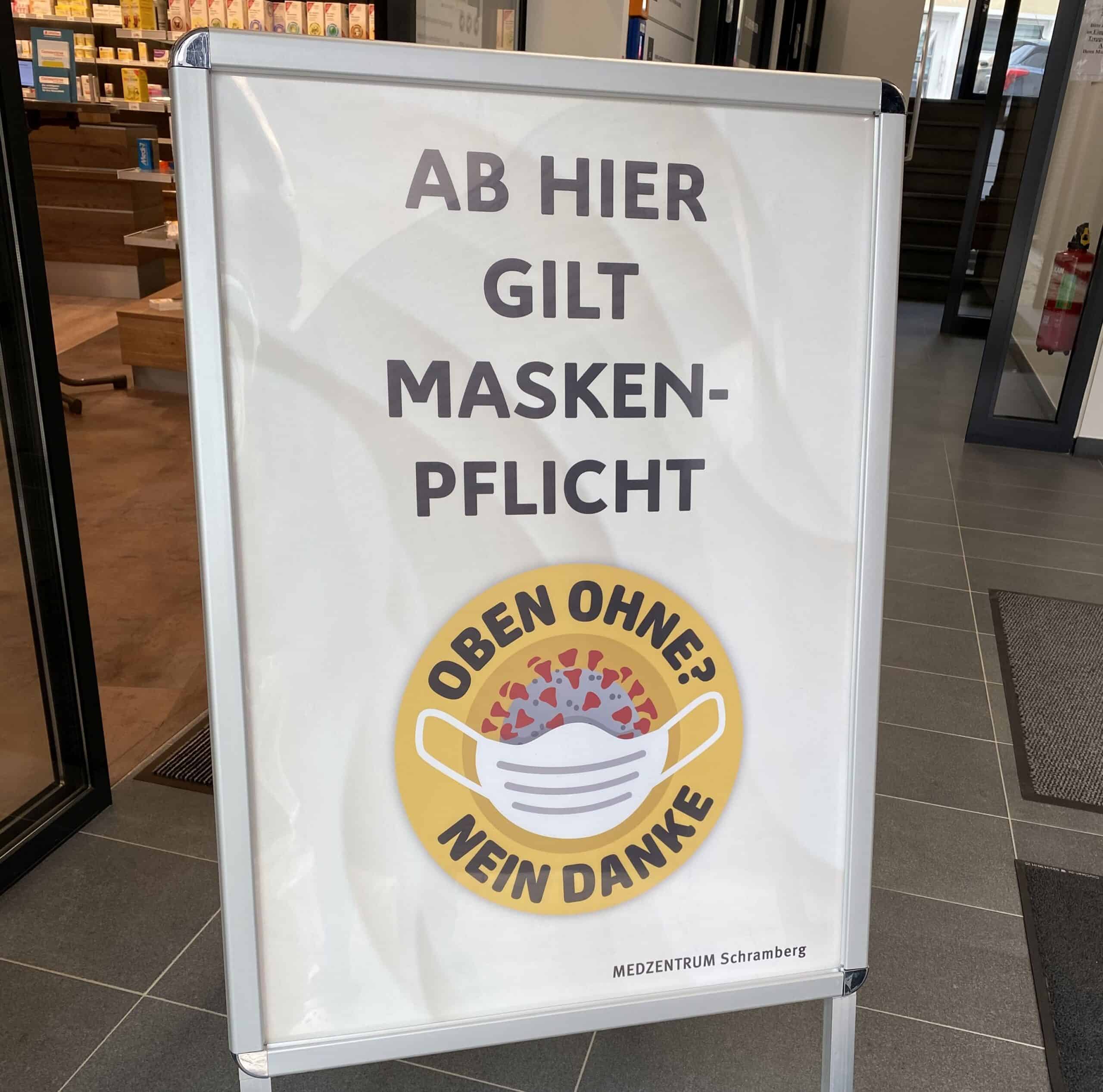 Ab dem 27. April steht ein großes Schild am Eingang zum Medzentrum: „Ab hier gilt Maskenpflicht!“