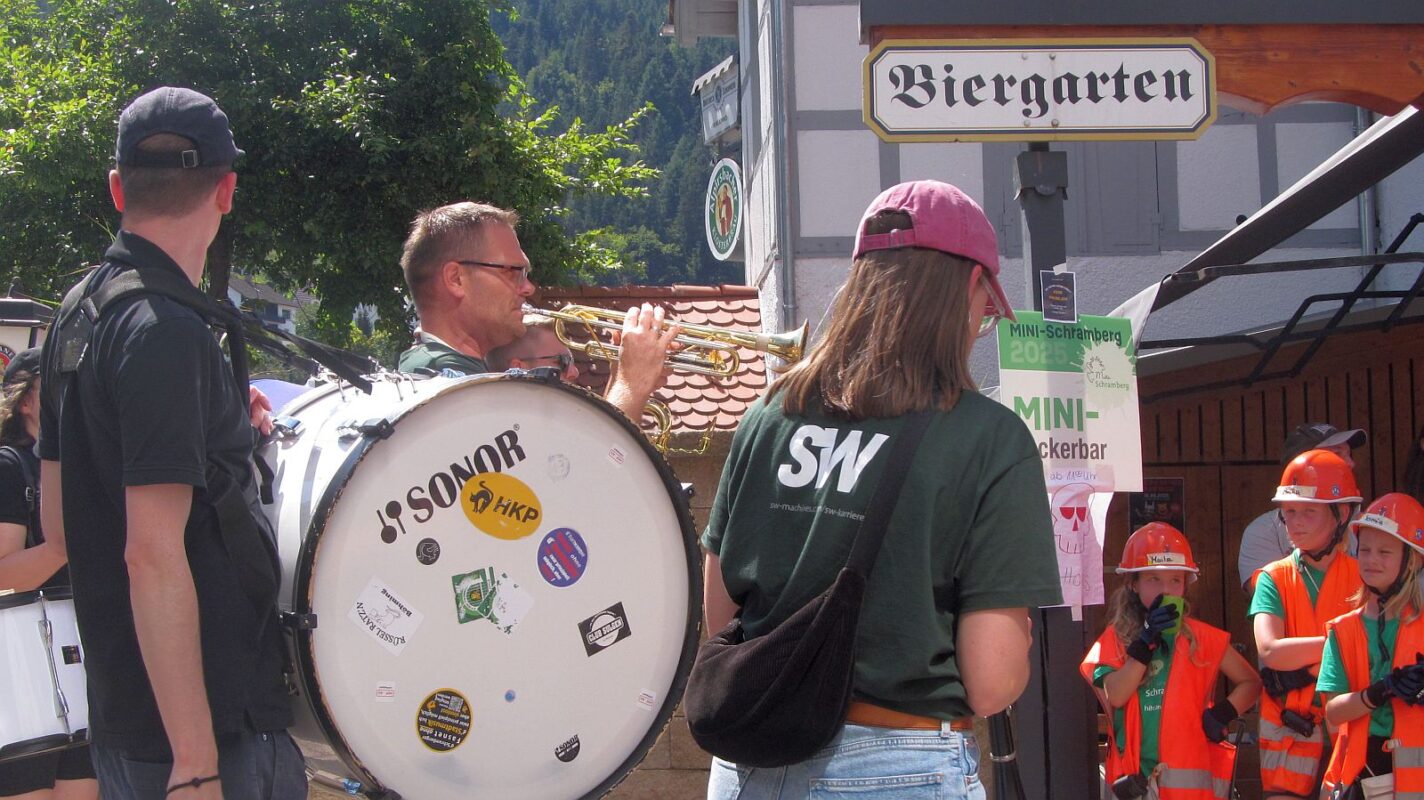 Dann sind die Türmlebläser losgelaufen und haben getrommelt. Sie sind zur Rockerbar marschiert. Dort waren Feuerwehr und Polizei. Bei der Rockerbar haben sie den Narrenmarsch gespielt. Die Kinder fanden es toll und haben geklatscht.