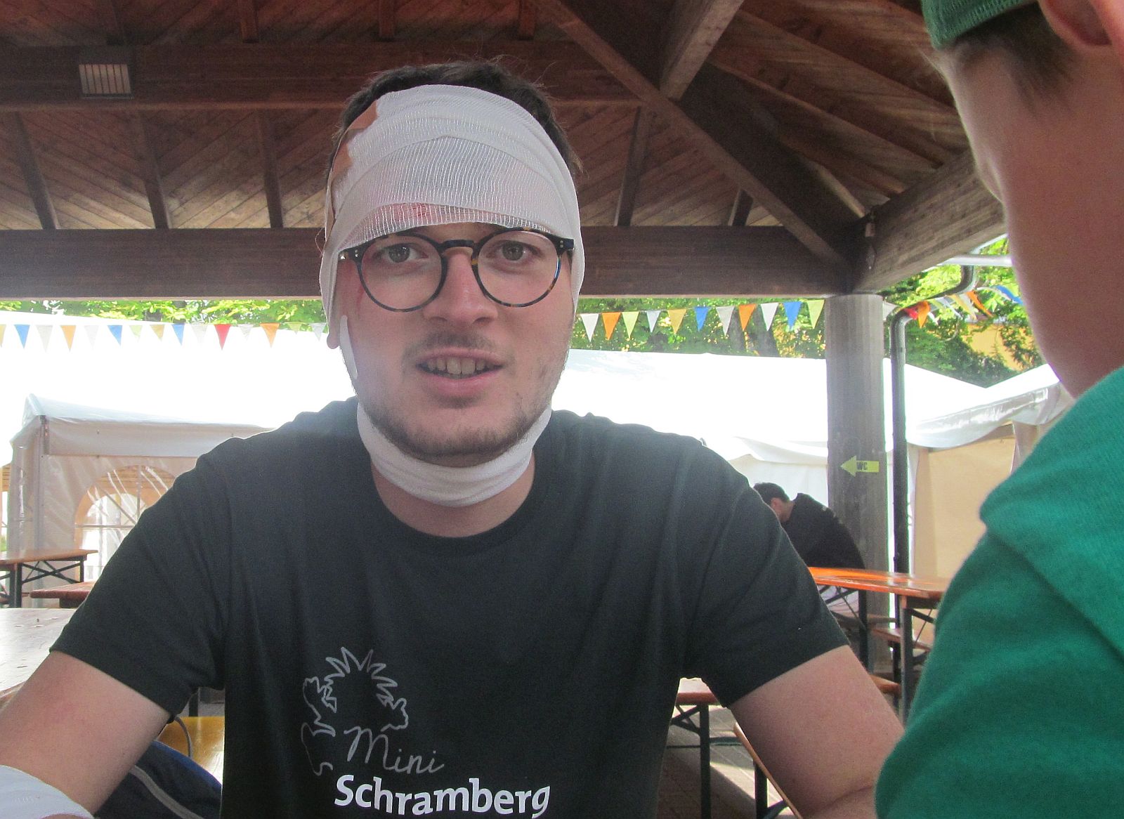 Er hat eine Platzwunde am Kopf und eine Schürfwunde am Arm.