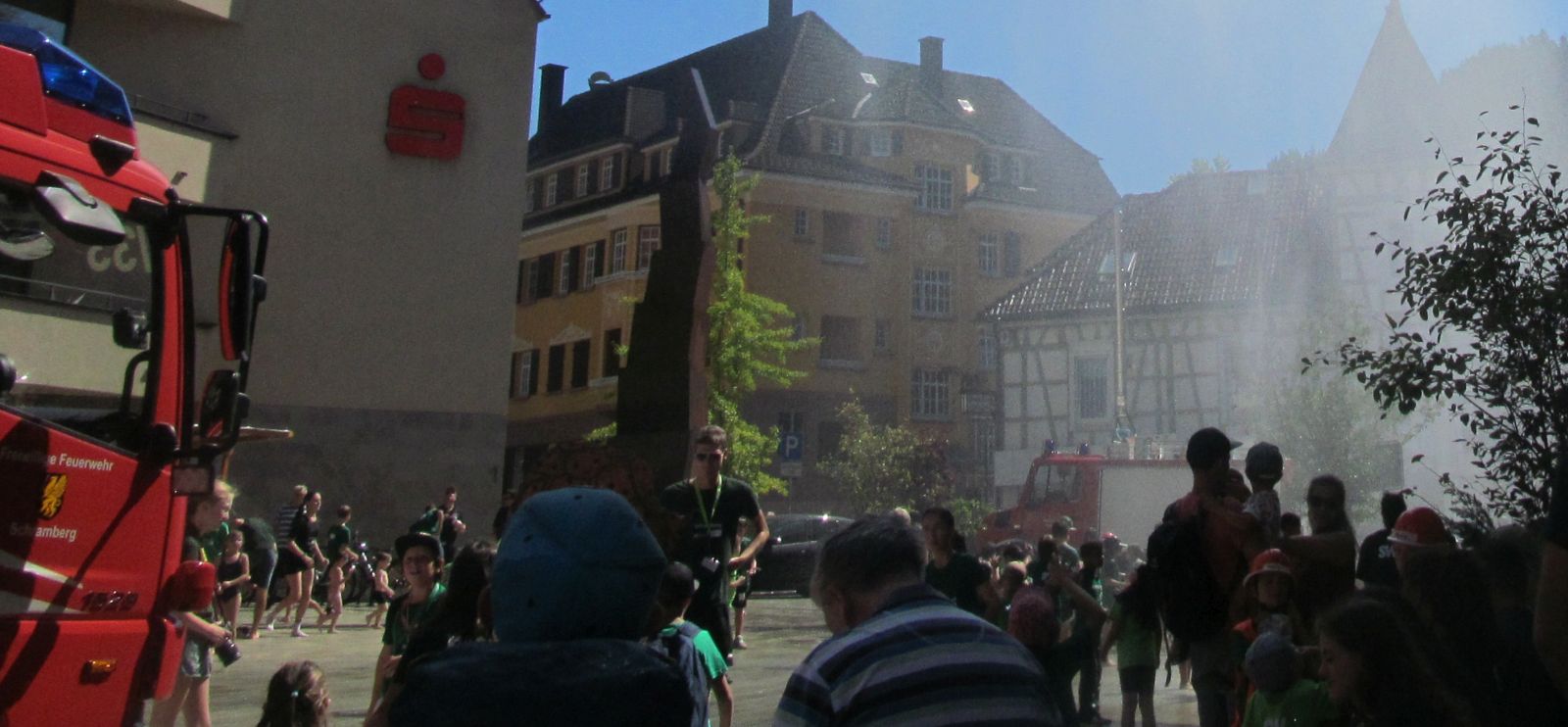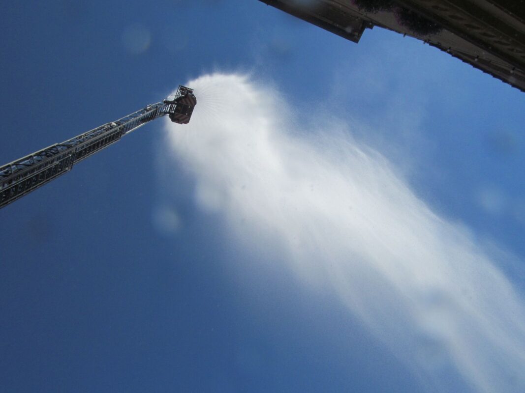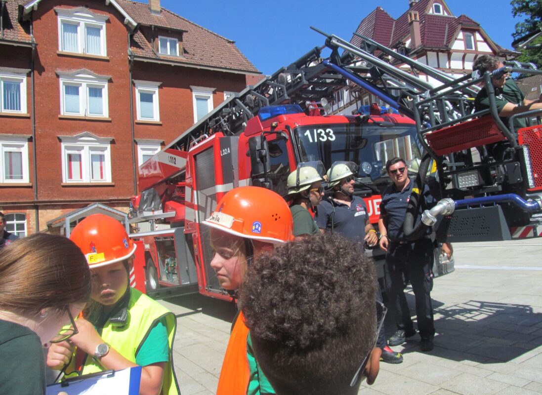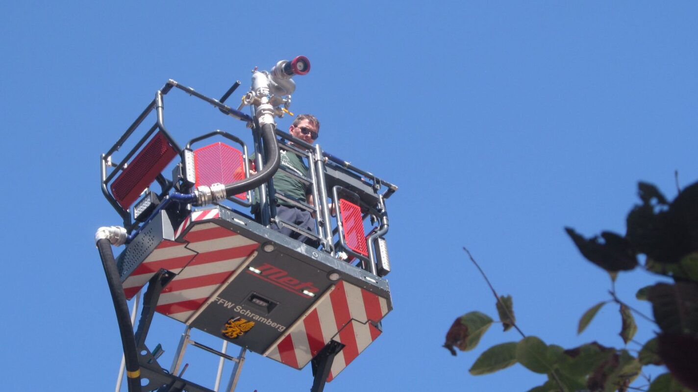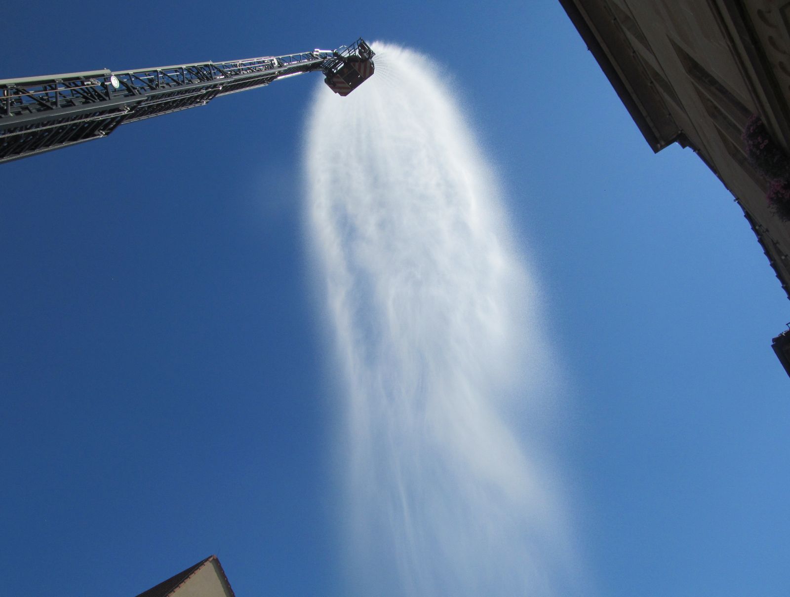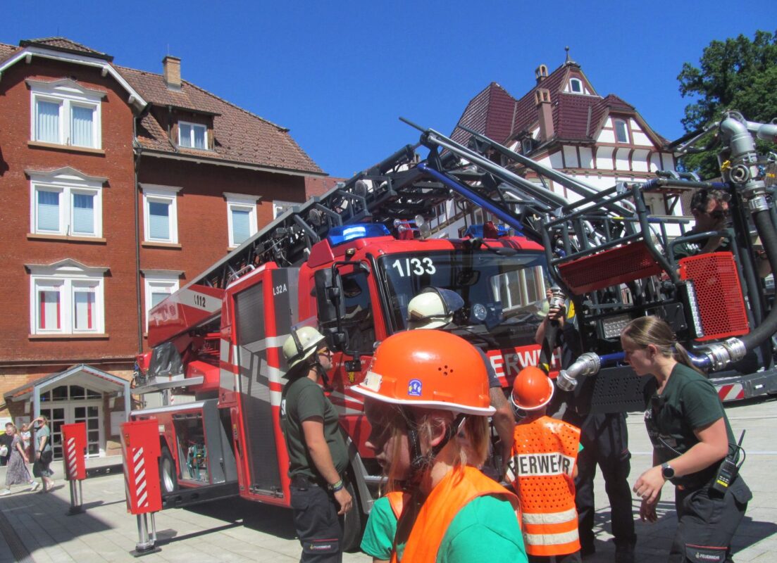 Heute Nachmittag um 15 Uhr stand die Feuerwehr mal wieder auf dem hinteren Rathausplatz. Mit der Drehleiter und Wasserschläuchen fuhren sie hoch in die Luft.