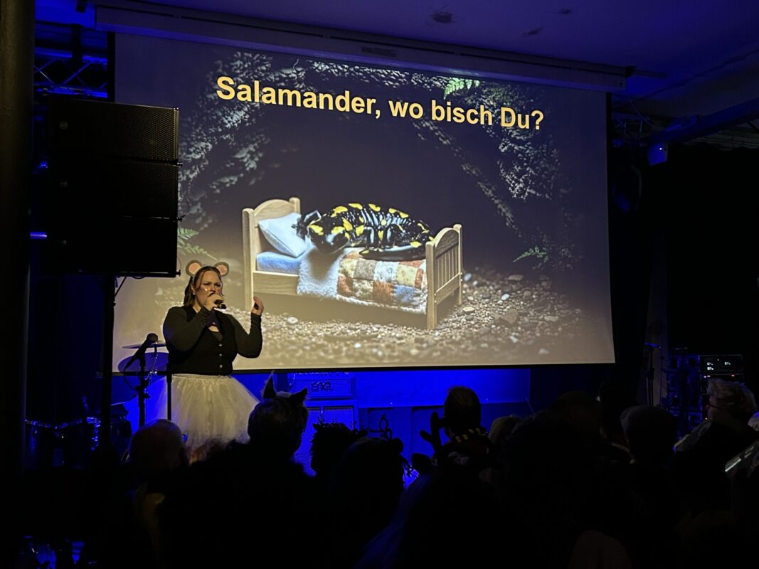 Vor der nächsten Nummer hielt Kuhner nach Martin Himmelheber Ausschau und meinte schließlich, „dann kann ich’s ja verzelle!“ Auf die Einladung der Presse zum Hausball meinte der stadtbekannte Journalist nämlich, dass die Winterpause der Baustelle nicht allein den Salamandern zu verdanken ist. Kuhner entgegnete ihm jedoch, dass sie „aus jeder Schnake einen Elefanten“ machen würden. So sei dann auch der oscarreife Kurzfilm „Bloß schnell weg, Salamander“ entstanden, zu dem Sophie Kussberger Live sang. Für die Dreharbeiten sei jedoch „kein Tier zu Schaden gekommen“, versicherte der KI-affine Kuhner.